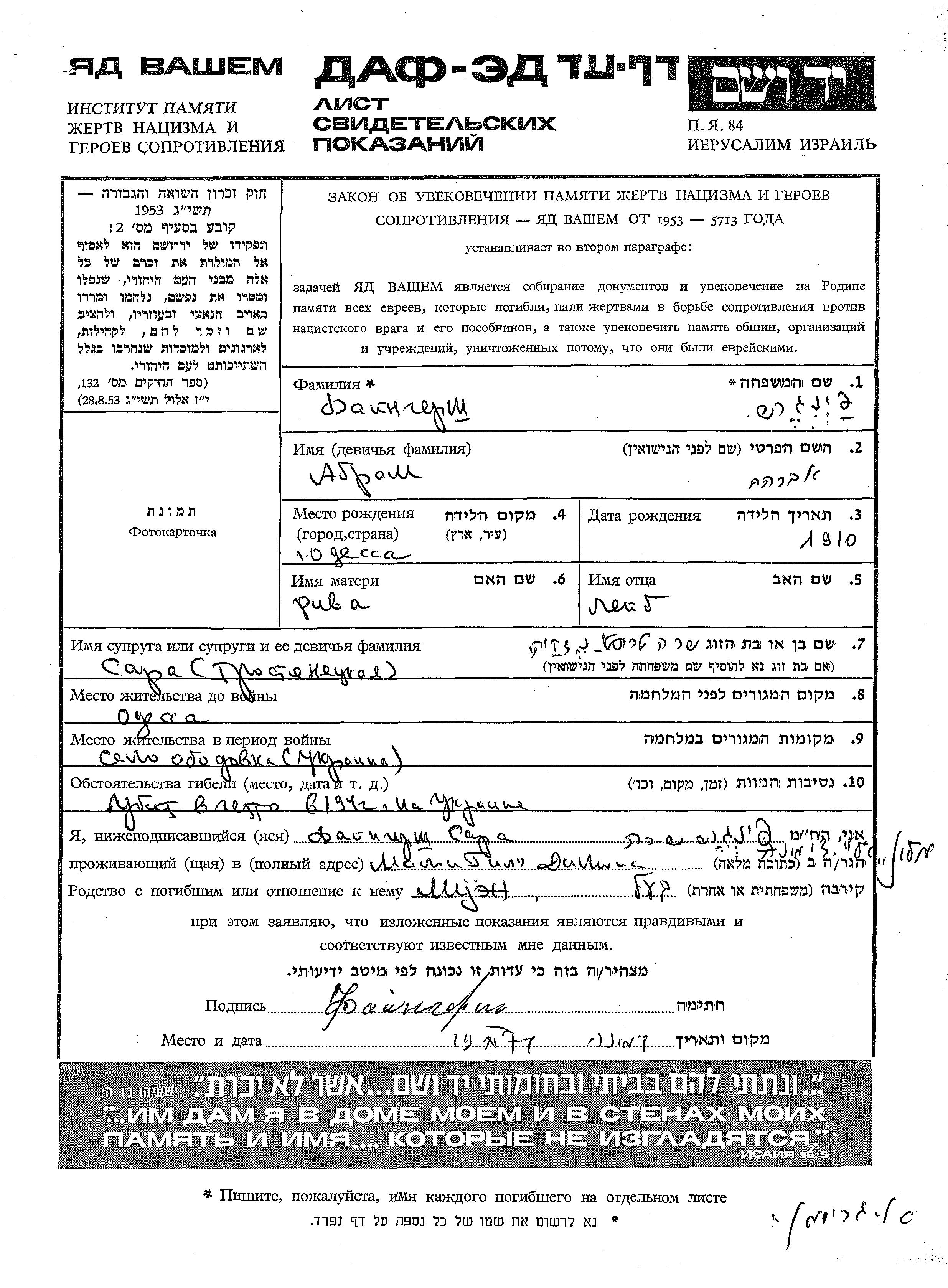 Faingersh Abram 1910 Odessa, Ukraine (UdSSR) Gedenkblatt