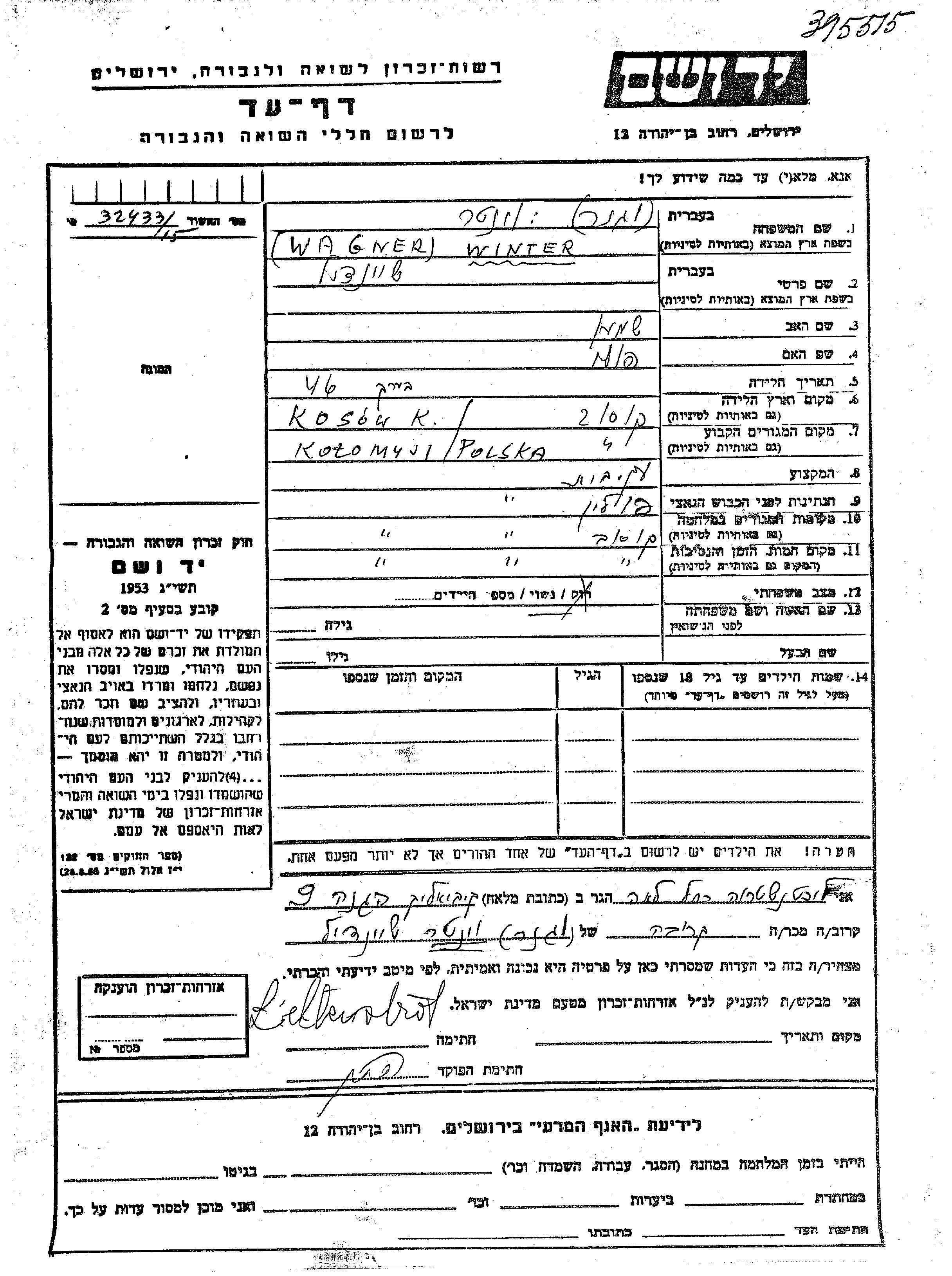 Sheindil Winter, geb. Wagner wurde in Kosow, Polen geboren. Sie war die Tochter von Shimon und Poli. Sie war Hausfrau und Verheiratet. Vor dem Zweiten Weltkrieg lebte sie in Kosow, Polen. Während des Krieges war sie in Kosow, Polen.