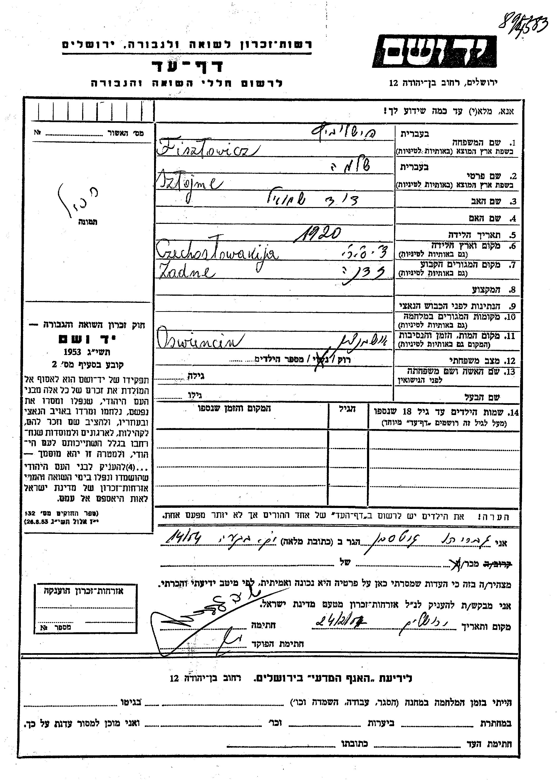 Szlojme wurde in der Schoah ermordet. Todesort: Auschwitz, Polen.