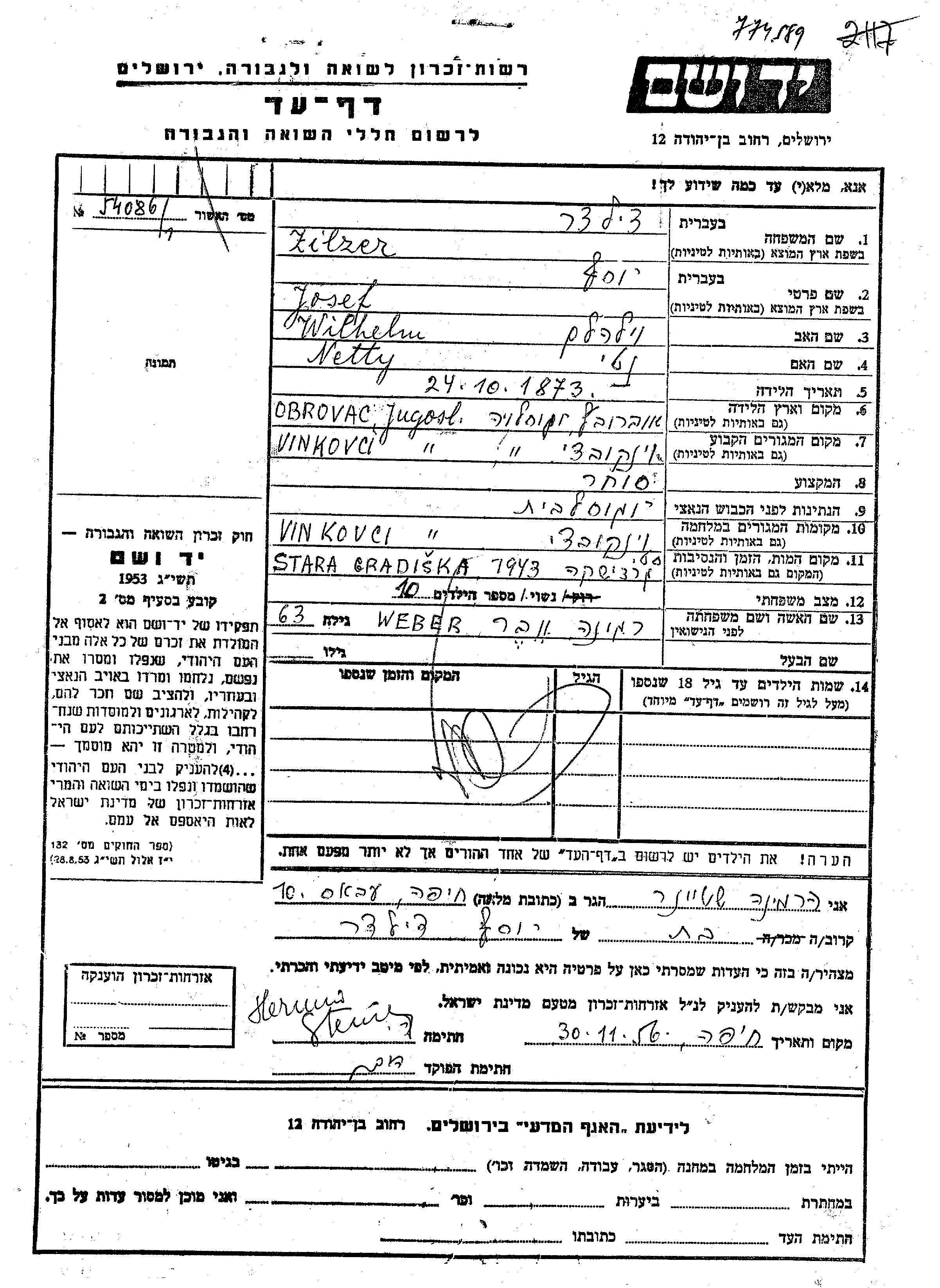 Josef Zilzer Tziltzer wurde im Jahr 1873 in Obrovac, Jugoslawien geboren. Er war der Sohn von Wilhelm und Netty Neti. Er war Kaufmann/-frau und mit Ramona, geb. Weber Verheiratet. Vor dem Zweiten Weltkrieg lebte er in Vinkovci, Jugoslawien. Während des Krieges war er in Vinkovci, Jugoslawien.