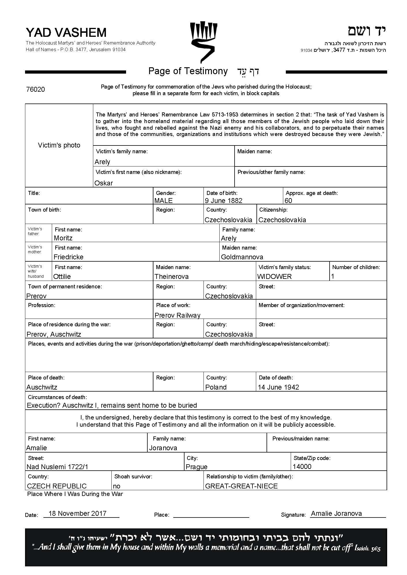 Arely | Oskar | 1882 | Prerov, Tschechoslowakei | Gedenkblatt (digital) |