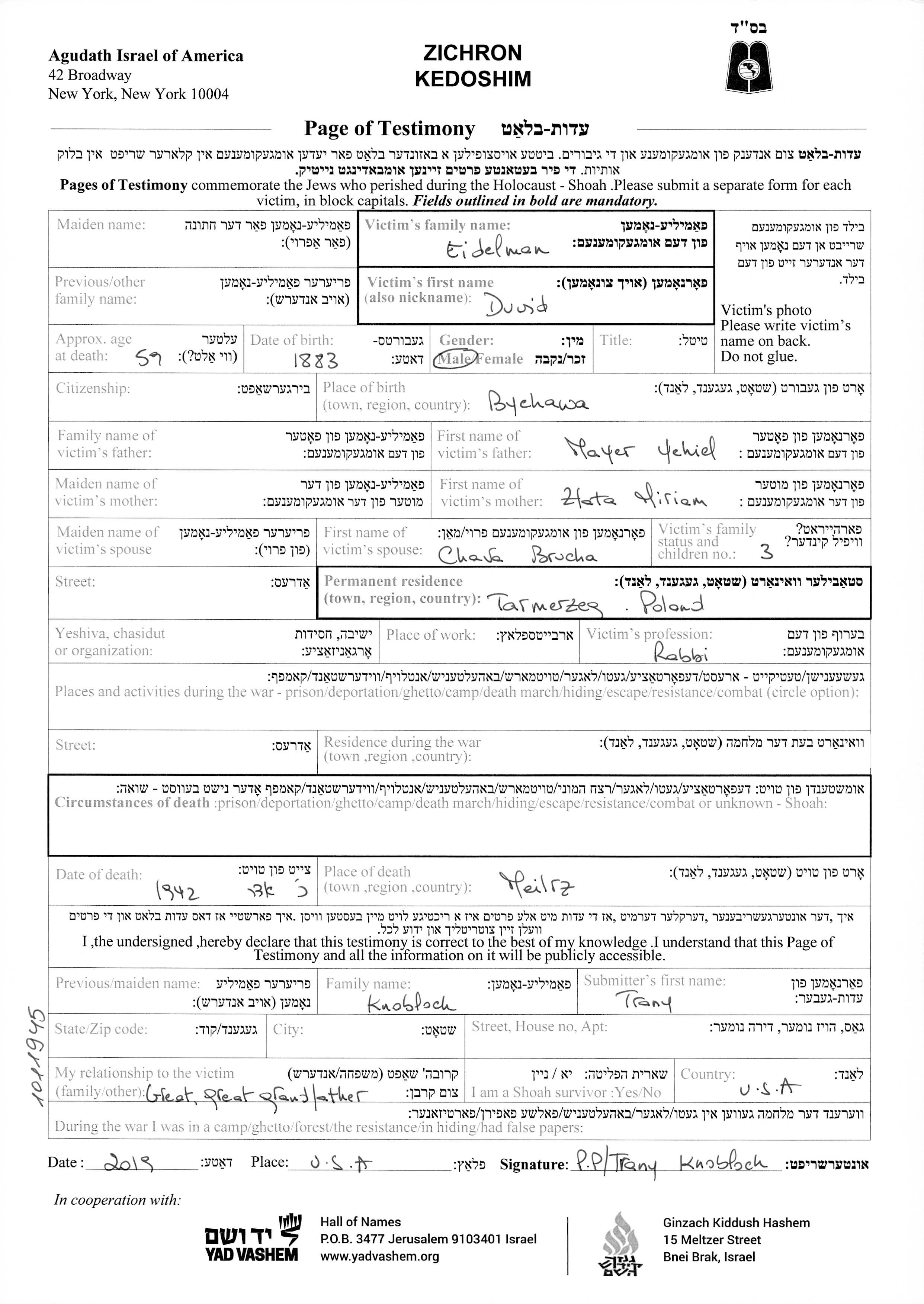 Duvid Eidelman wurde im Jahr 1883 in Bychawa, Polen geboren. Er war der Sohn von Mayer Ychiel und Zlata Miriam. Er war Rabbiner. Vor dem Zweiten Weltkrieg lebte er in Tarnobrzeg, Polen.