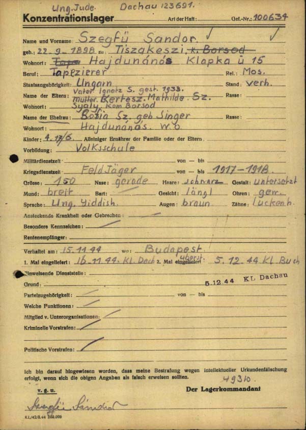 Szegfű Sandor 1898 Hajdunanas, Ungarn Kartei des Internationalen Suchdienstes Bad Arolsen