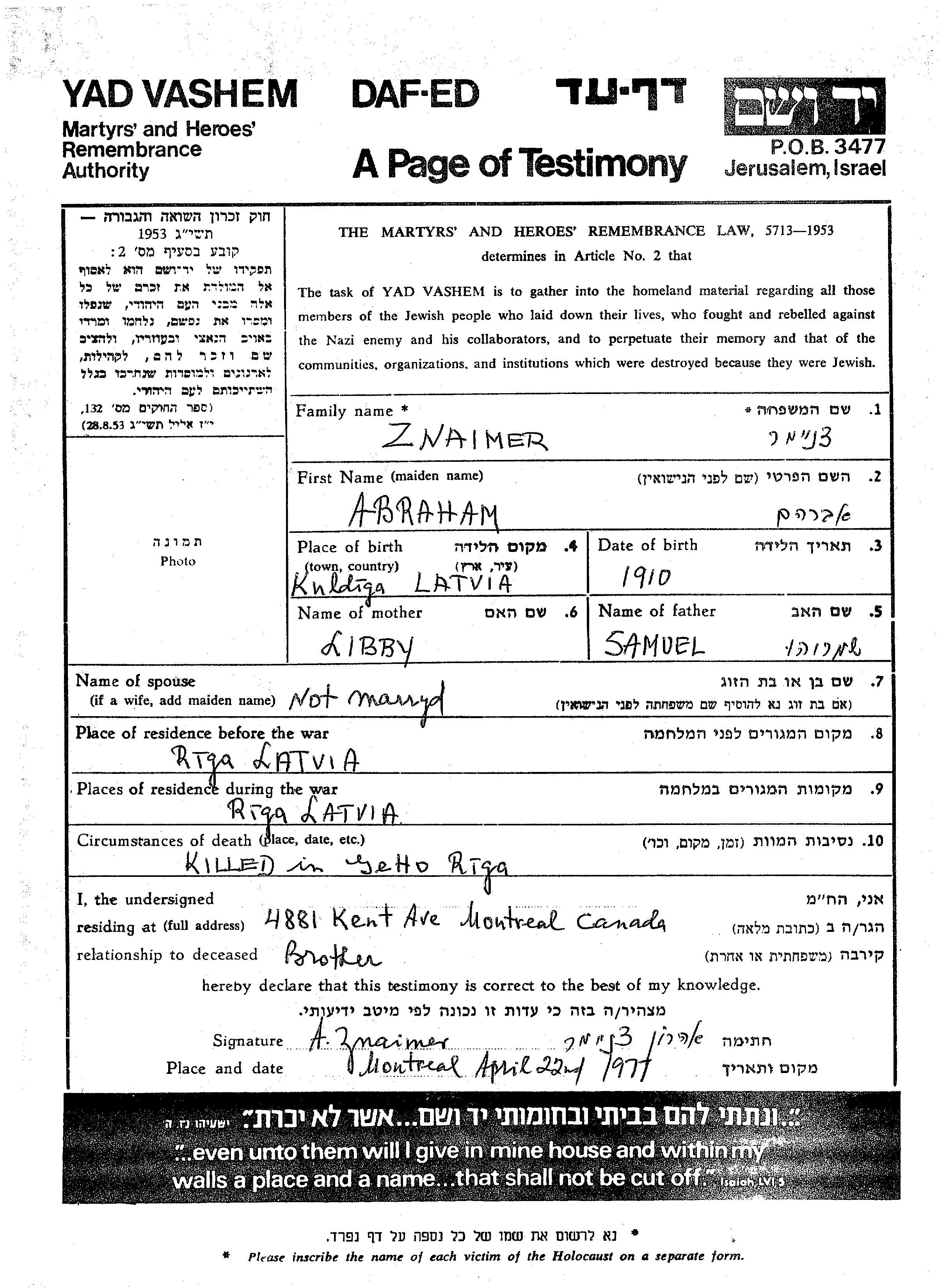 Abraham Znaimer Tzneimer wurde im Jahr 1910 in Kuldiga, Lettland geboren. Er war der Sohn von Shmariahu Samuel und Libby. Er war Ledig. Vor dem Zweiten Weltkrieg lebte er in Riga, Lettland. Während des Krieges war er in Riga, Lettland.