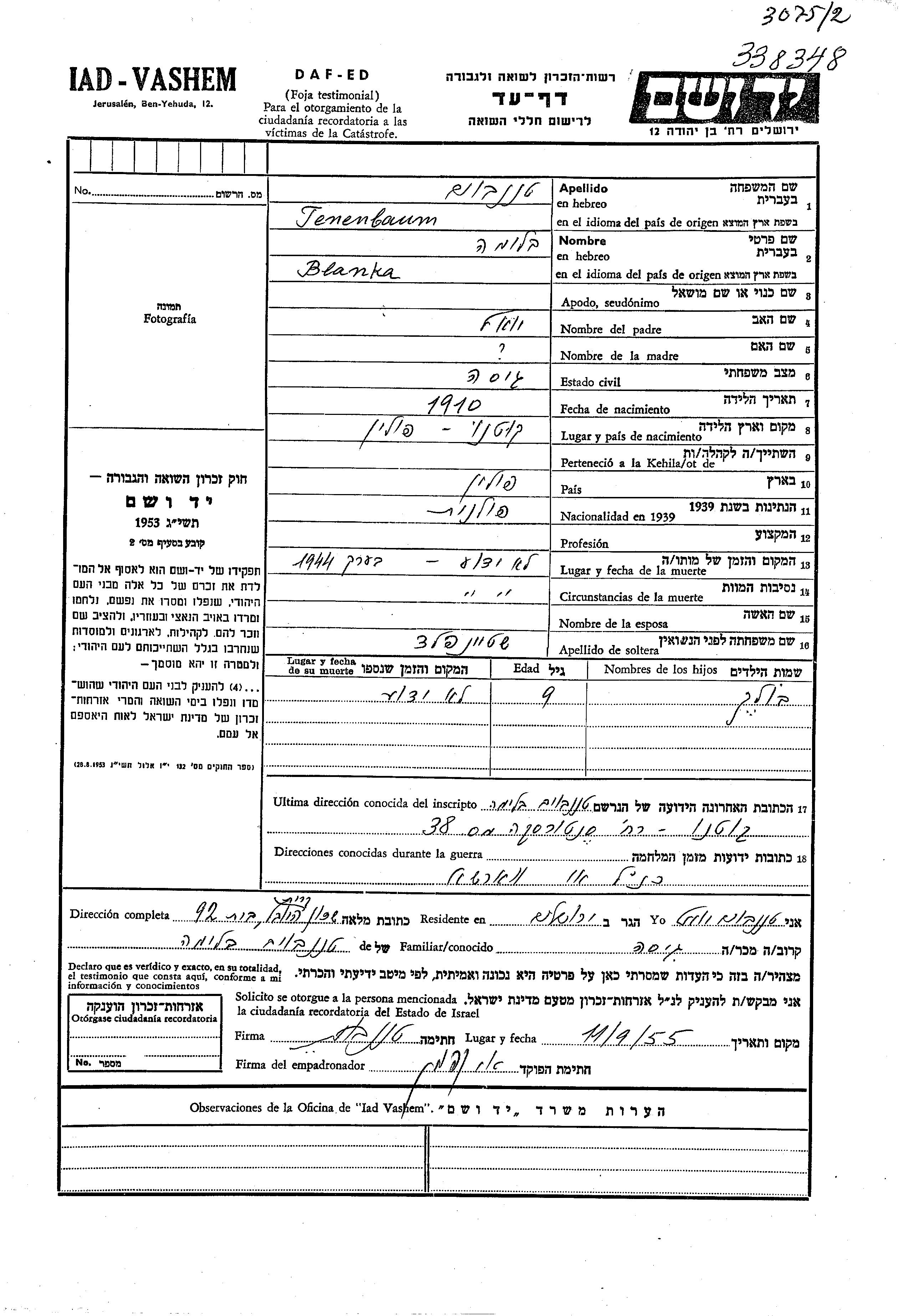 Blanka Bluma Tenenbaum, geb. Shteinfeld wurde im Jahr 1910 in Kutno, Polen geboren. Sie war die Tochter von Yoel. Sie war Verheiratet. Vor dem Zweiten Weltkrieg lebte sie in Polen. Während des Krieges war sie in Kutno, Polen.