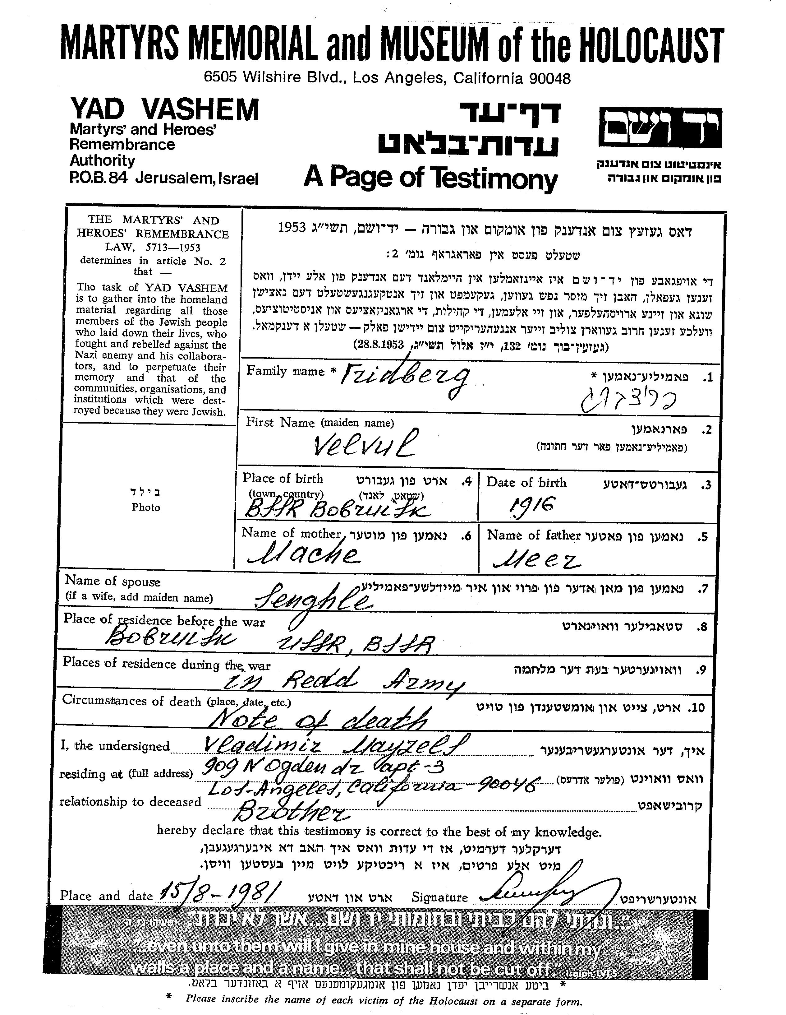 Velvul Fridberg wurde im Jahr 1916 in Bobruysk, Weißrussland (UdSSR) geboren. Er war der Sohn von Meer und Nache. Er war Verheiratet. Vor dem Zweiten Weltkrieg lebte er in Bobruysk, Weißrussland (UdSSR). Während des Krieges war er in die Sowjetischen Streitkräfte. Velvul im Militärdienst umgekommen.
