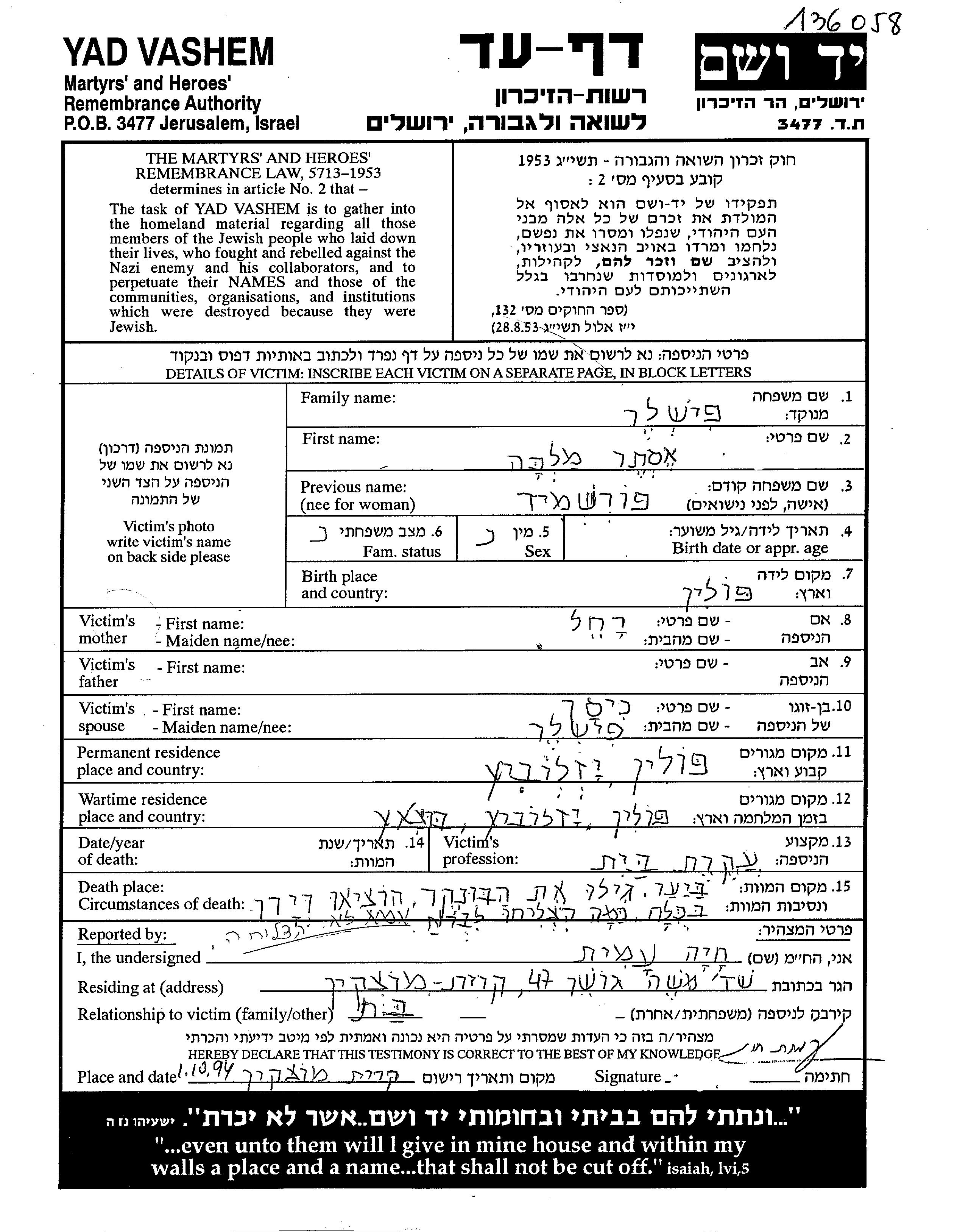 Malka Ester Fishler, geb. Furshmid wurde in Yazlovets, Polen geboren. Sie war Hausfrau. Vor dem Zweiten Weltkrieg lebte sie in Buczacz, Polen.