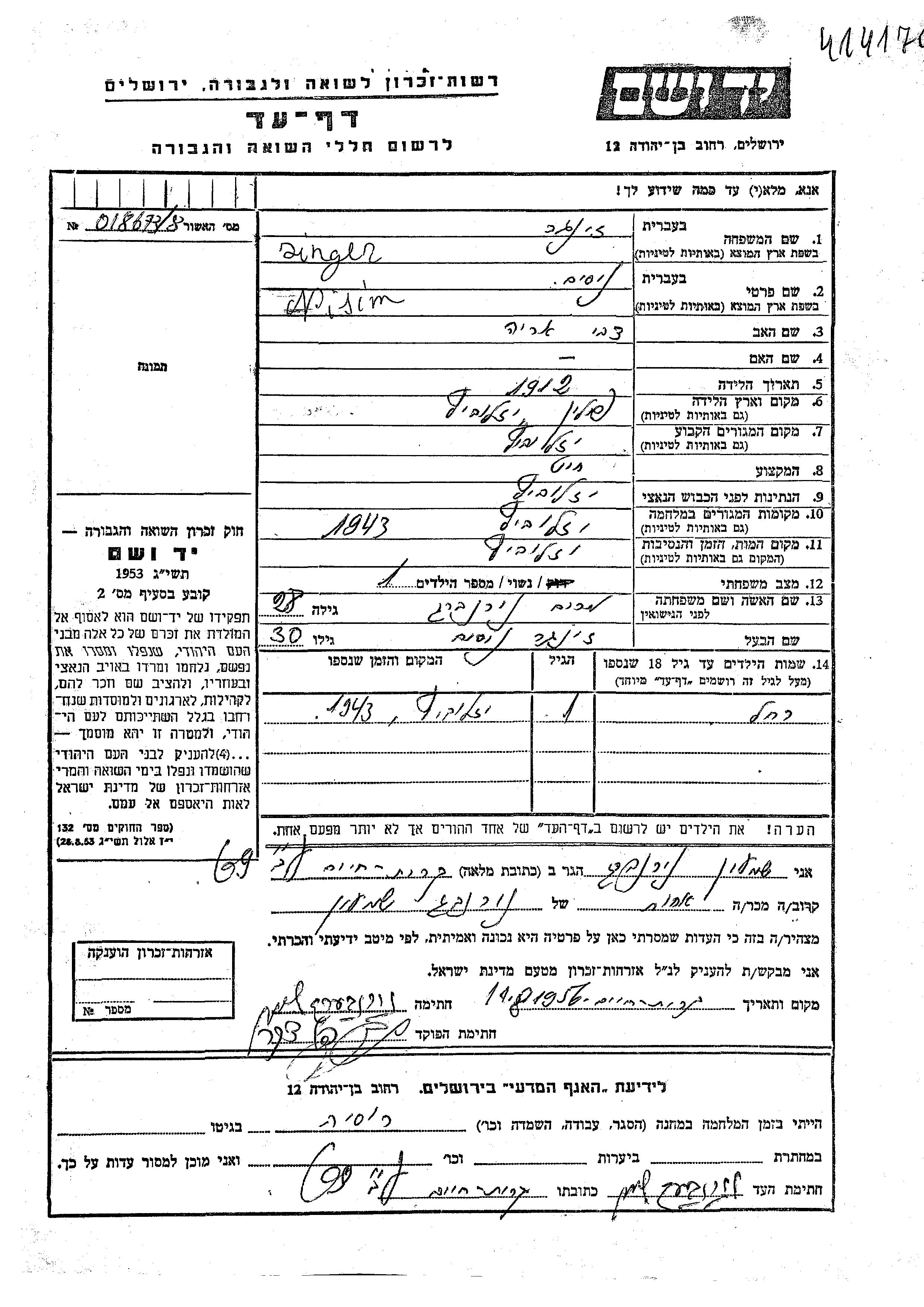 Nisim Nisan Zinger wurde im Jahr 1912 in Jazlowiec, Polen geboren. Er war Schneider. Vor dem Zweiten Weltkrieg lebte er in Jazlowiec, Polen.