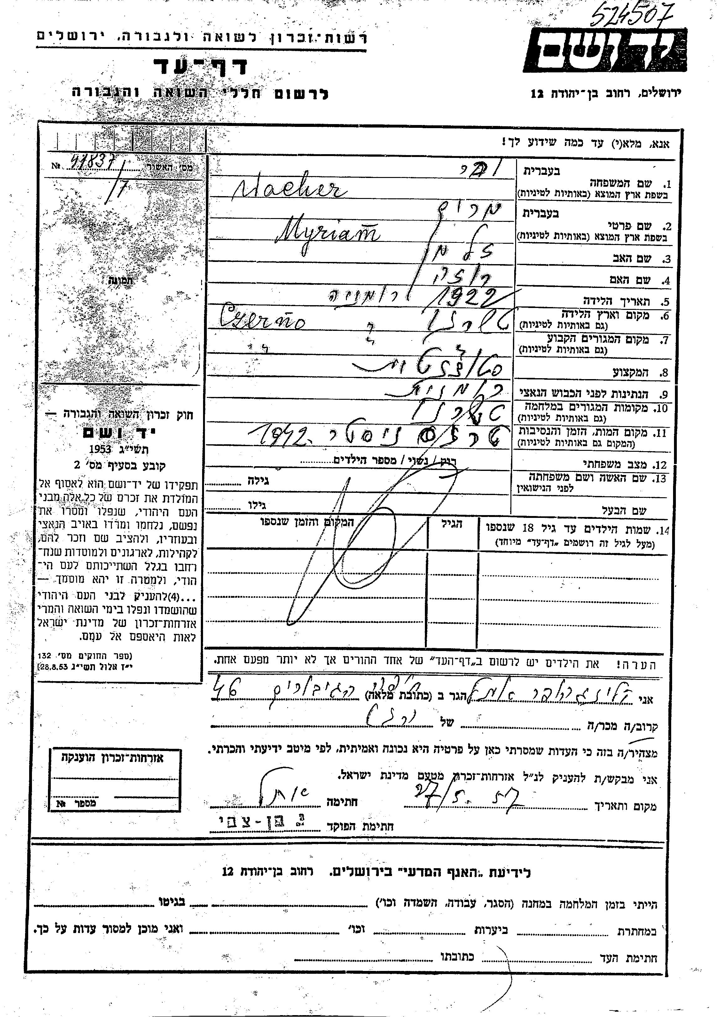 Wacher Myriam 1922 Cernauti, Rumänien Gedenkblatt