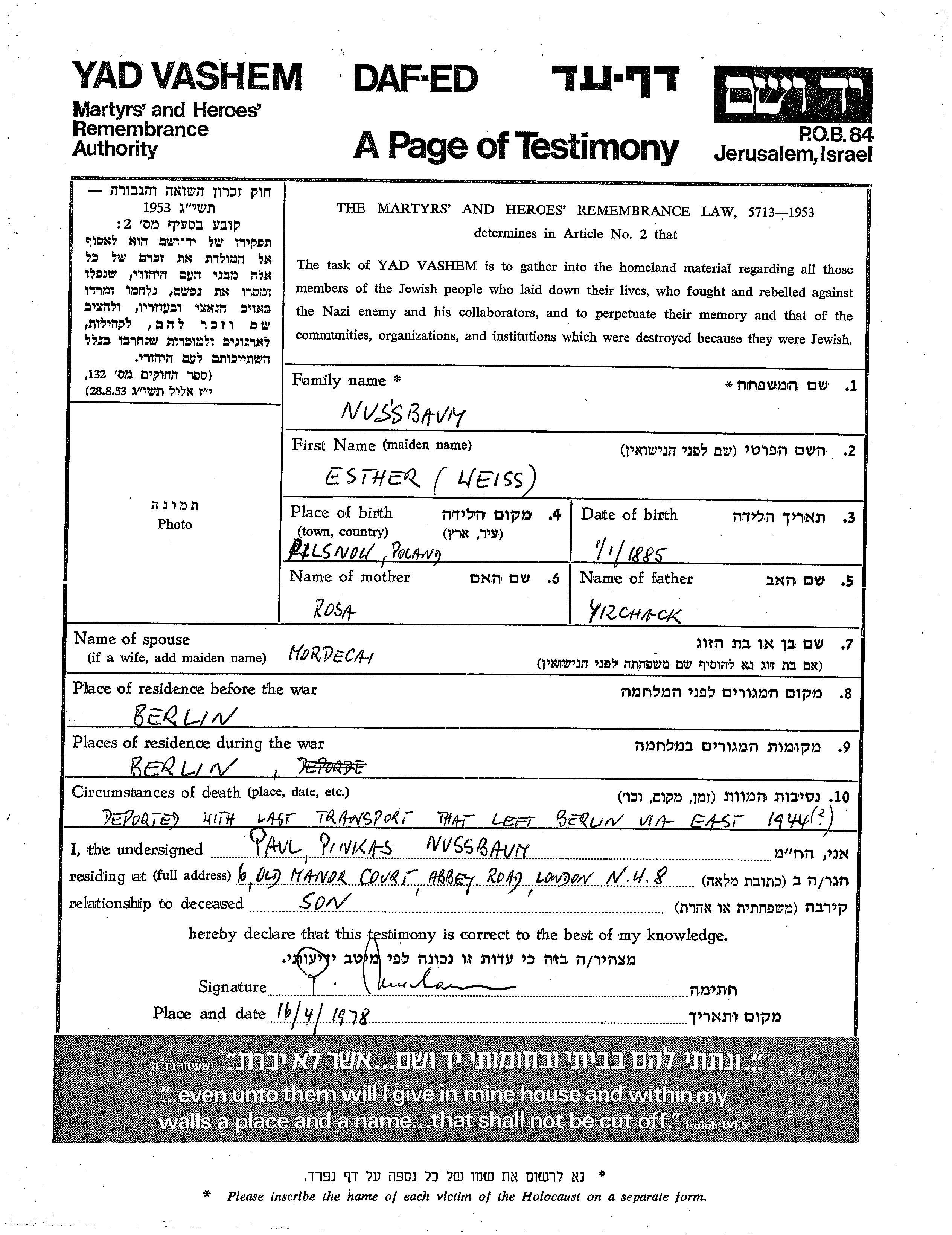 Esther Nußbaum, geb. Weiss wurde im Jahr 1885 geboren. Sie war die Tochter von Yizchack und Rosa. Sie war mit Mordecai Verheiratet. Vor dem Zweiten Weltkrieg lebte sie in Berlin, Deutsches Reich. Während des Krieges war sie in Berlin, Deutsches Reich.