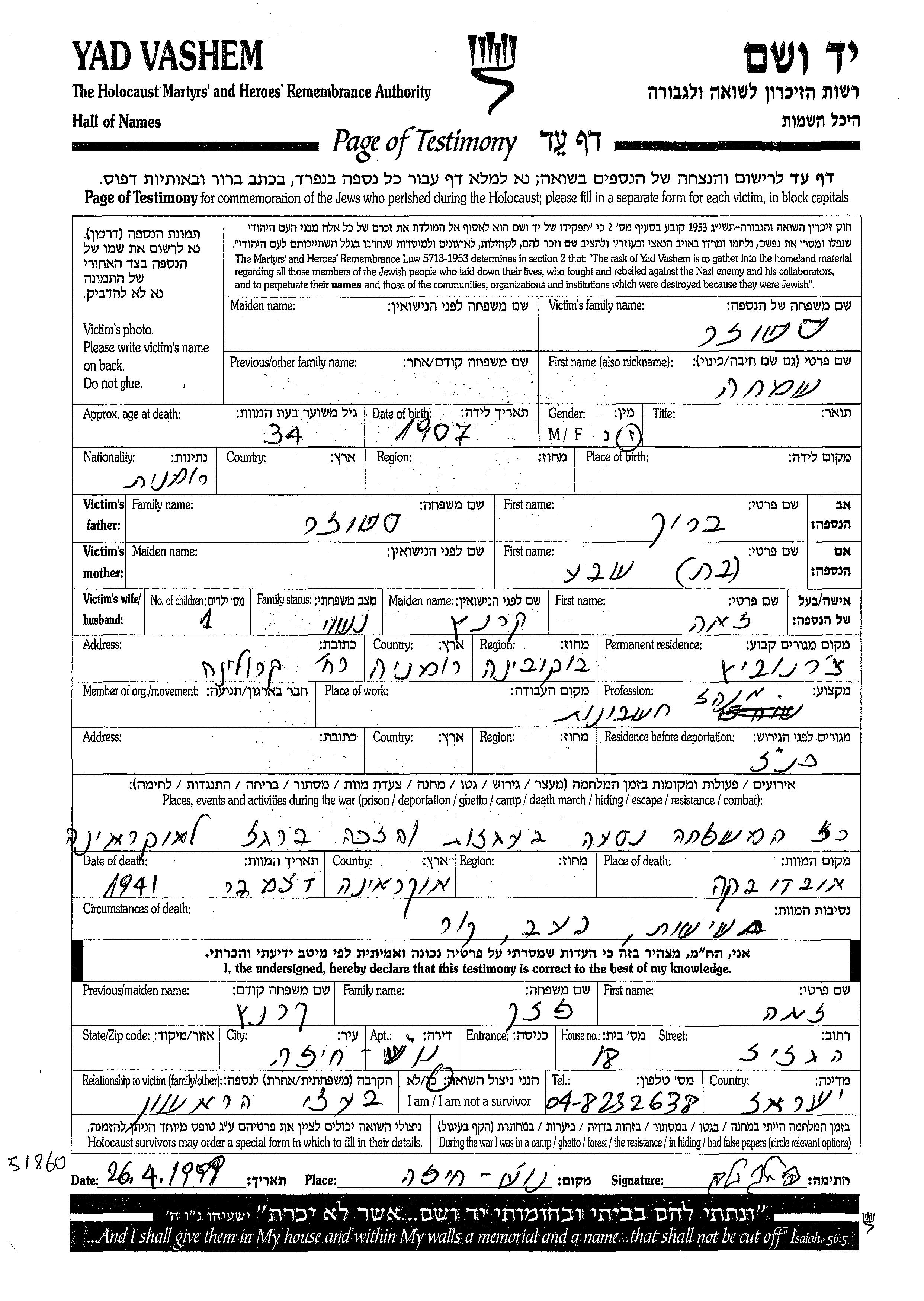 Stolyar | Simkha | 1907 | Czernowitz, Rumänien | Gedenkblatt |