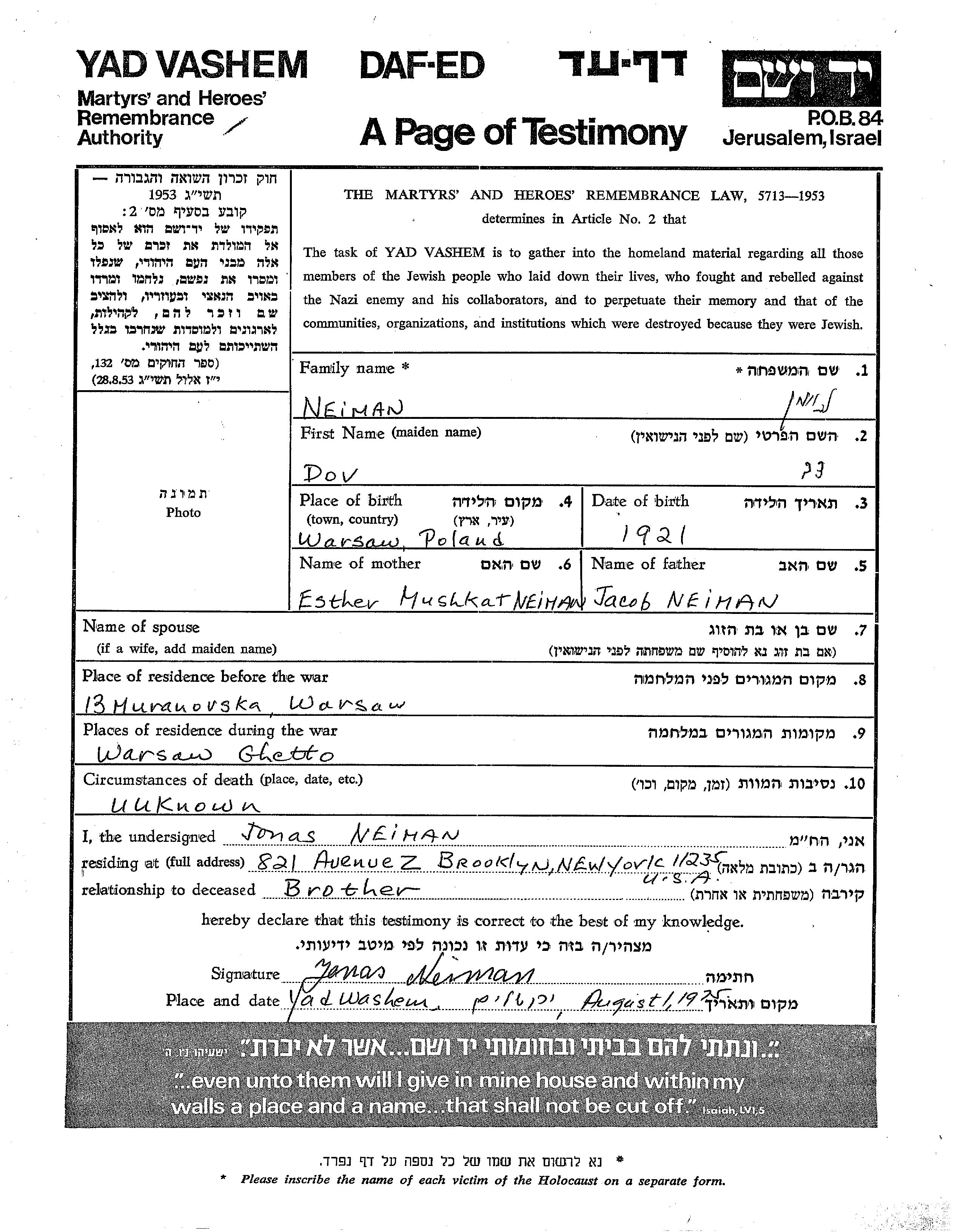 Dov Neiman wurde im Jahr 1921 in Warsaw, Polen geboren. Er war der Sohn von Jacob und Esther. Vor dem Zweiten Weltkrieg lebte er in Warsaw, Polen. Während des Krieges war er in Warsaw, Polen.
