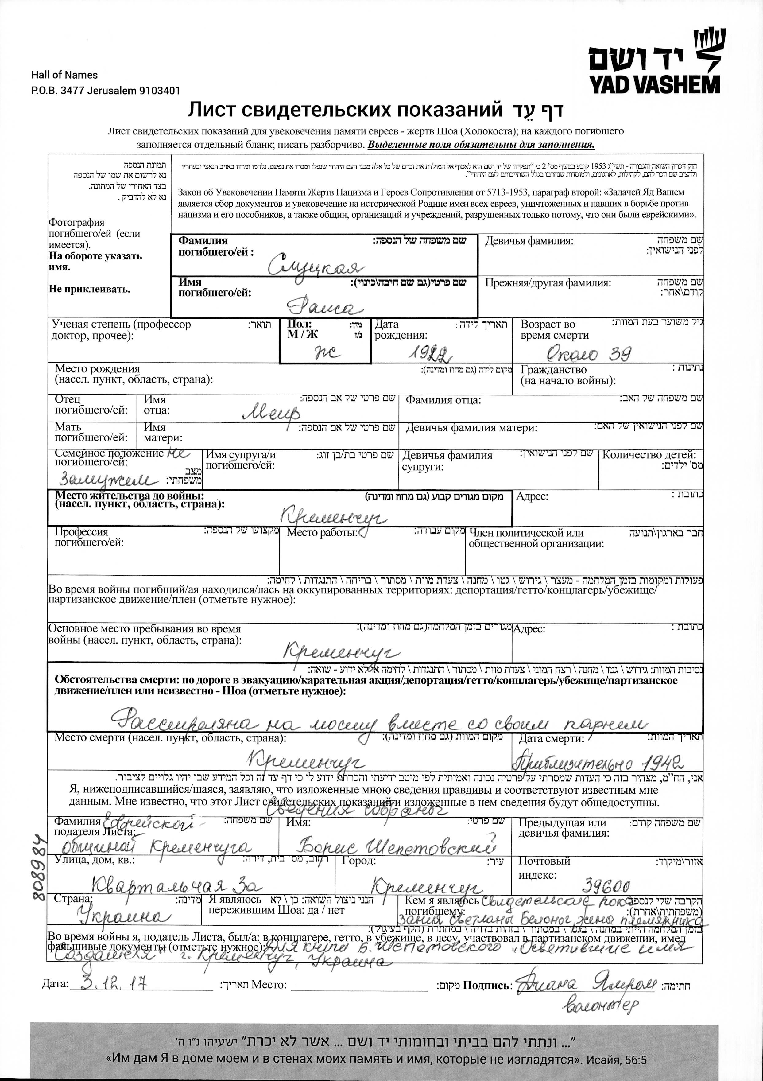 Raisa wurde in der Schoah ermordet. Todesort: Kremenchug, Ukraine (UdSSR) im Jahr 1942.