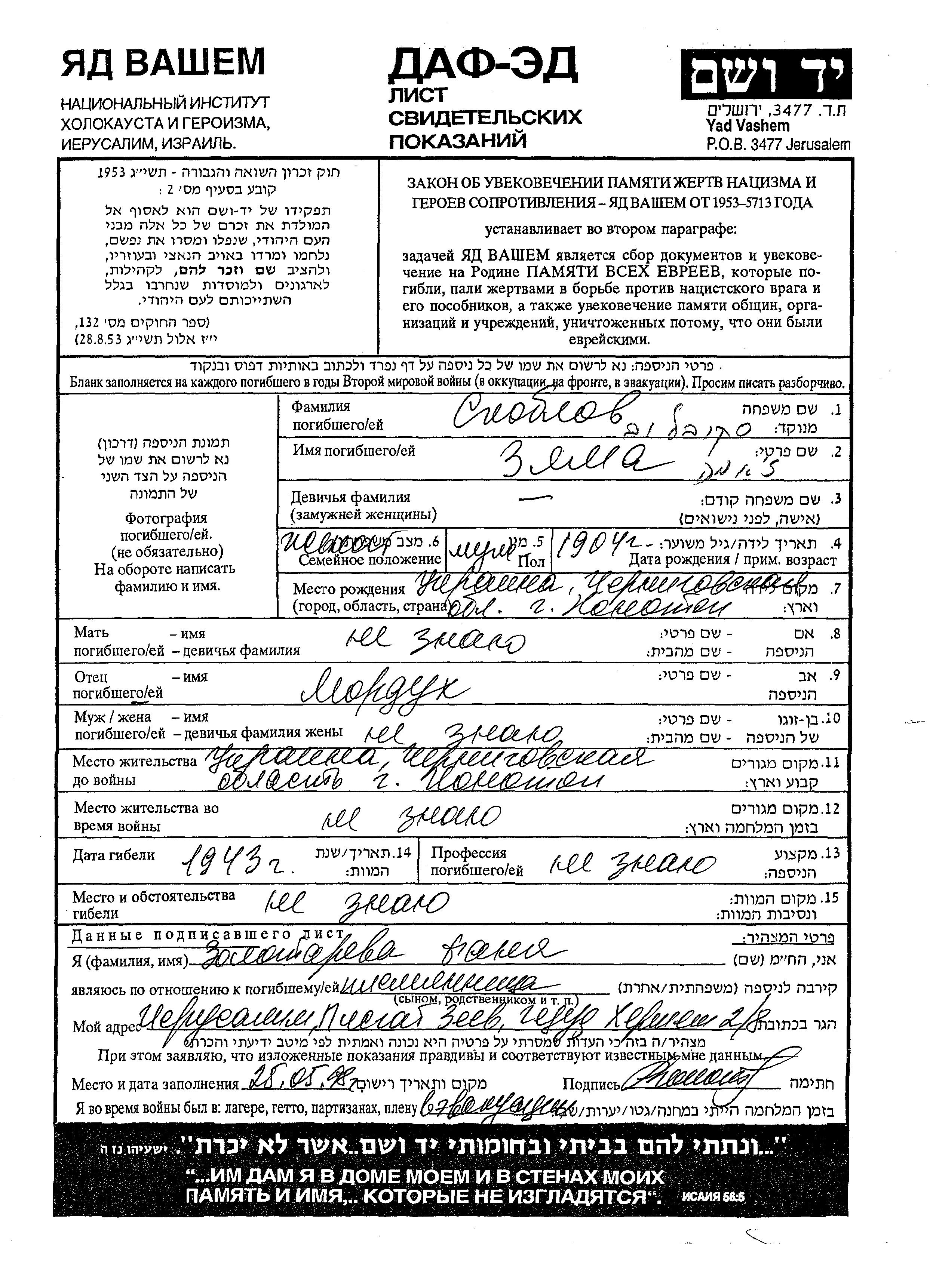 Ziama Skoblov wurde im Jahr 1904 in Konotop, Ukraine (UdSSR) geboren. Er war der Sohn von Mordukh. Er war Verheiratet. Vor dem Zweiten Weltkrieg lebte er in Konotop, Ukraine (UdSSR).