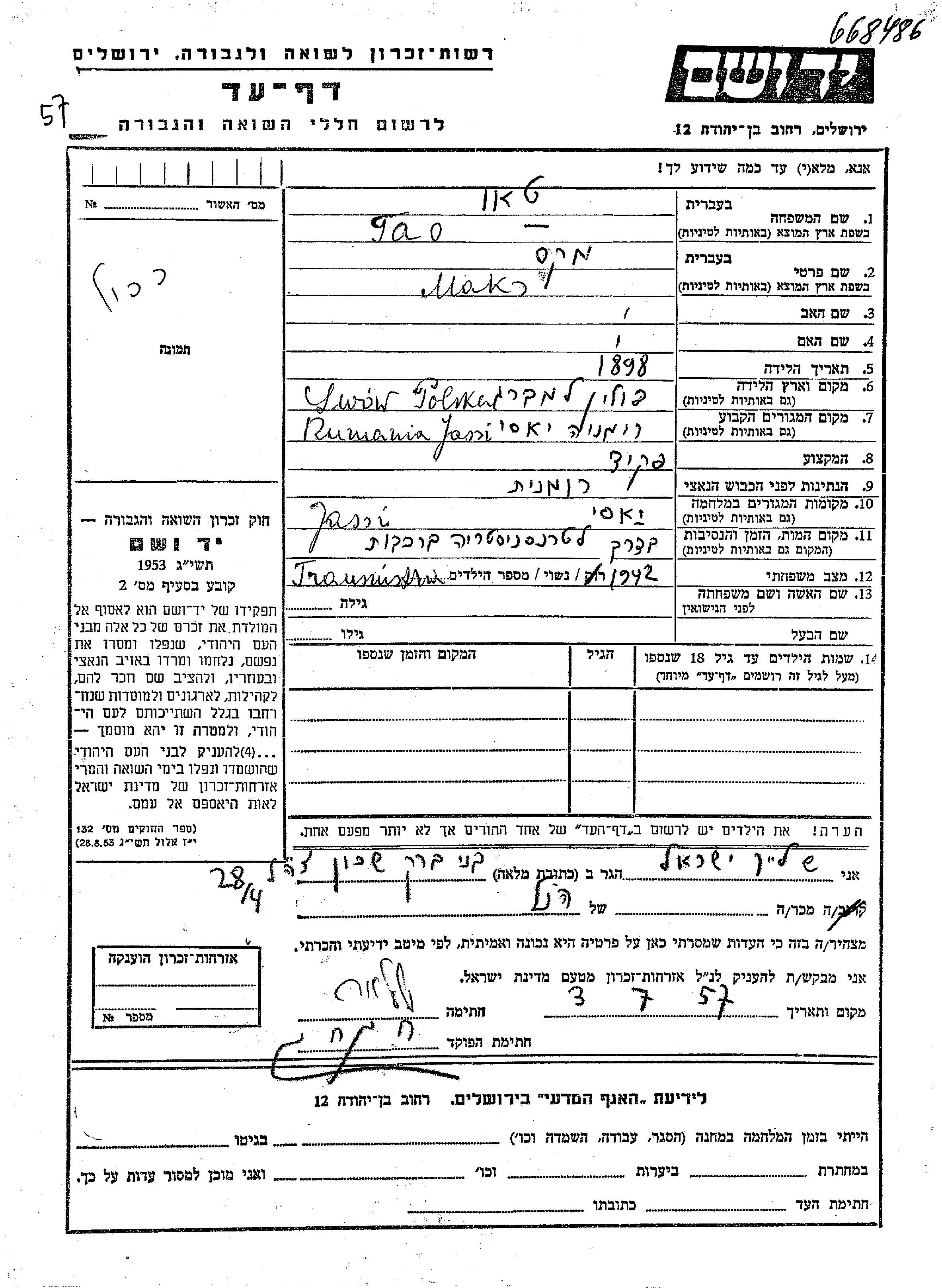 Max Tau wurde im Jahr 1898 in Lwow, Polen geboren. Er war Angestellte/-r und Verheiratet. Vor dem Zweiten Weltkrieg lebte er in Jassi, Rumänien. Während des Krieges war er in Jassi, Rumänien.