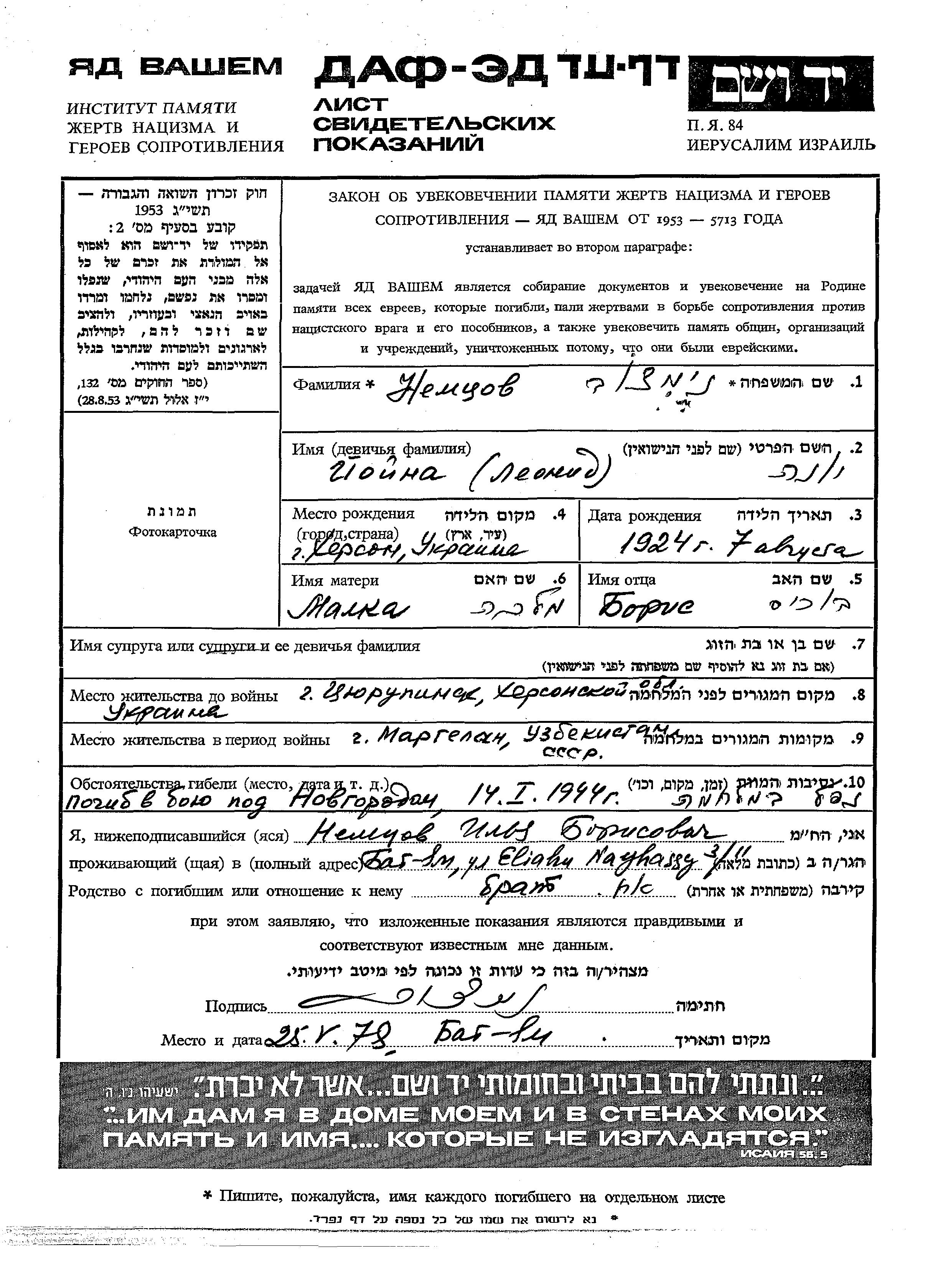 Ioina Leonid Niemtzov wurde im Jahr 1924 in Kherson, Ukraine (UdSSR) geboren. Er war der Sohn von Boris und Malka. Während des Krieges war er in Margelan, Uzbekistan (UdSSR).