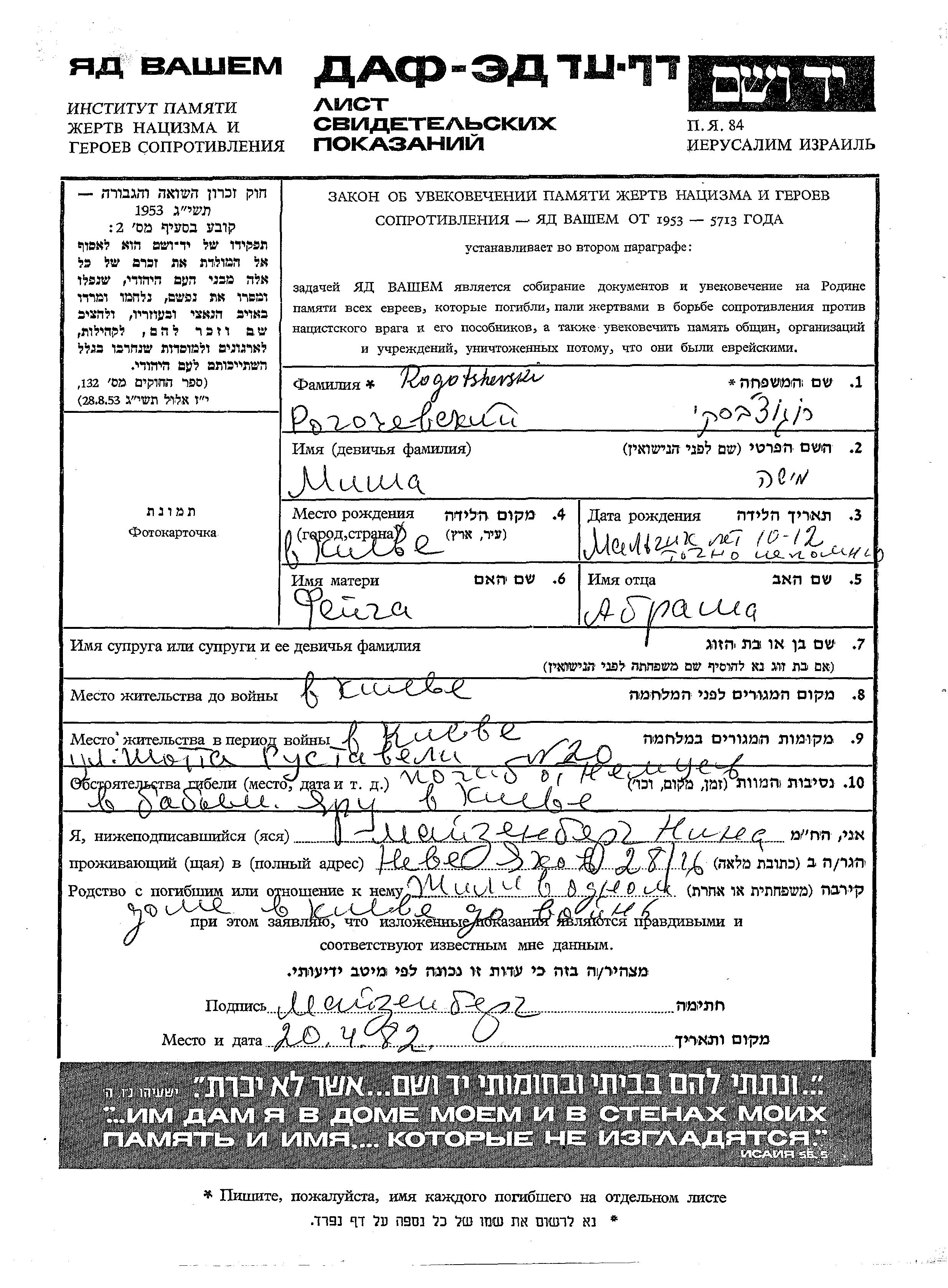 Misha Rogochevski wurde in Kiev, Ukraine (UdSSR) geboren. Er war der Sohn von Abrasha und Feiga. Er war Schüler/-in und Kind. Vor dem Zweiten Weltkrieg lebte er in Kiev, Ukraine (UdSSR). Während des Krieges war er in Kiev, Ukraine (UdSSR).