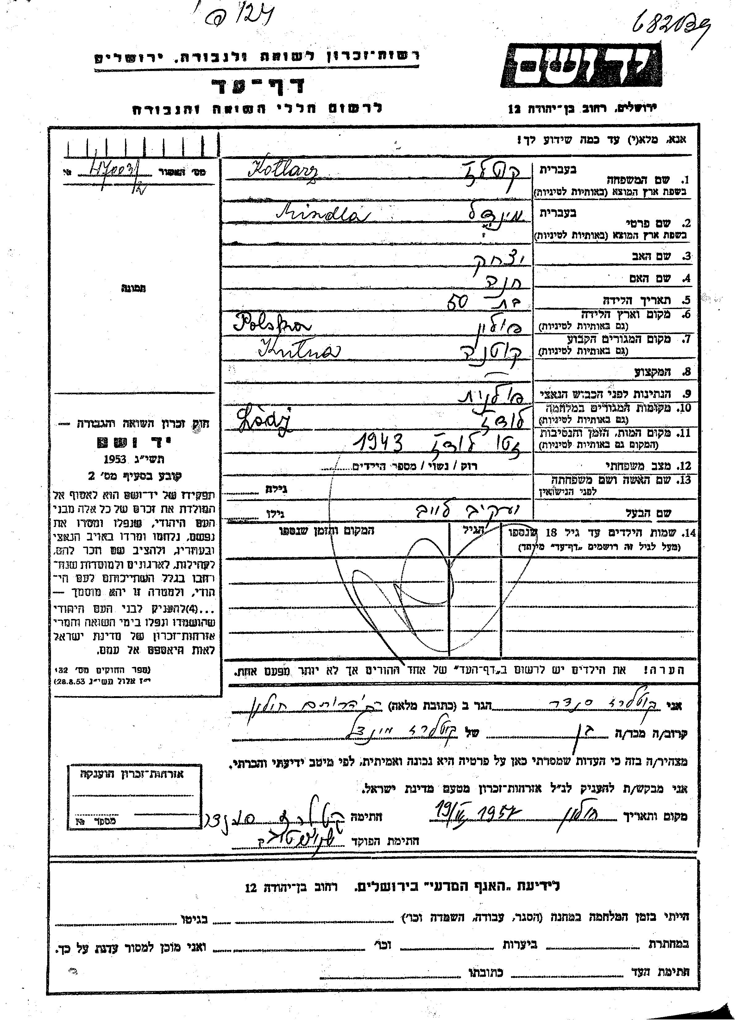 Mindla wurde in der Schoah ermordet. Todesort: Lodz, Polen im Jahr 1943.