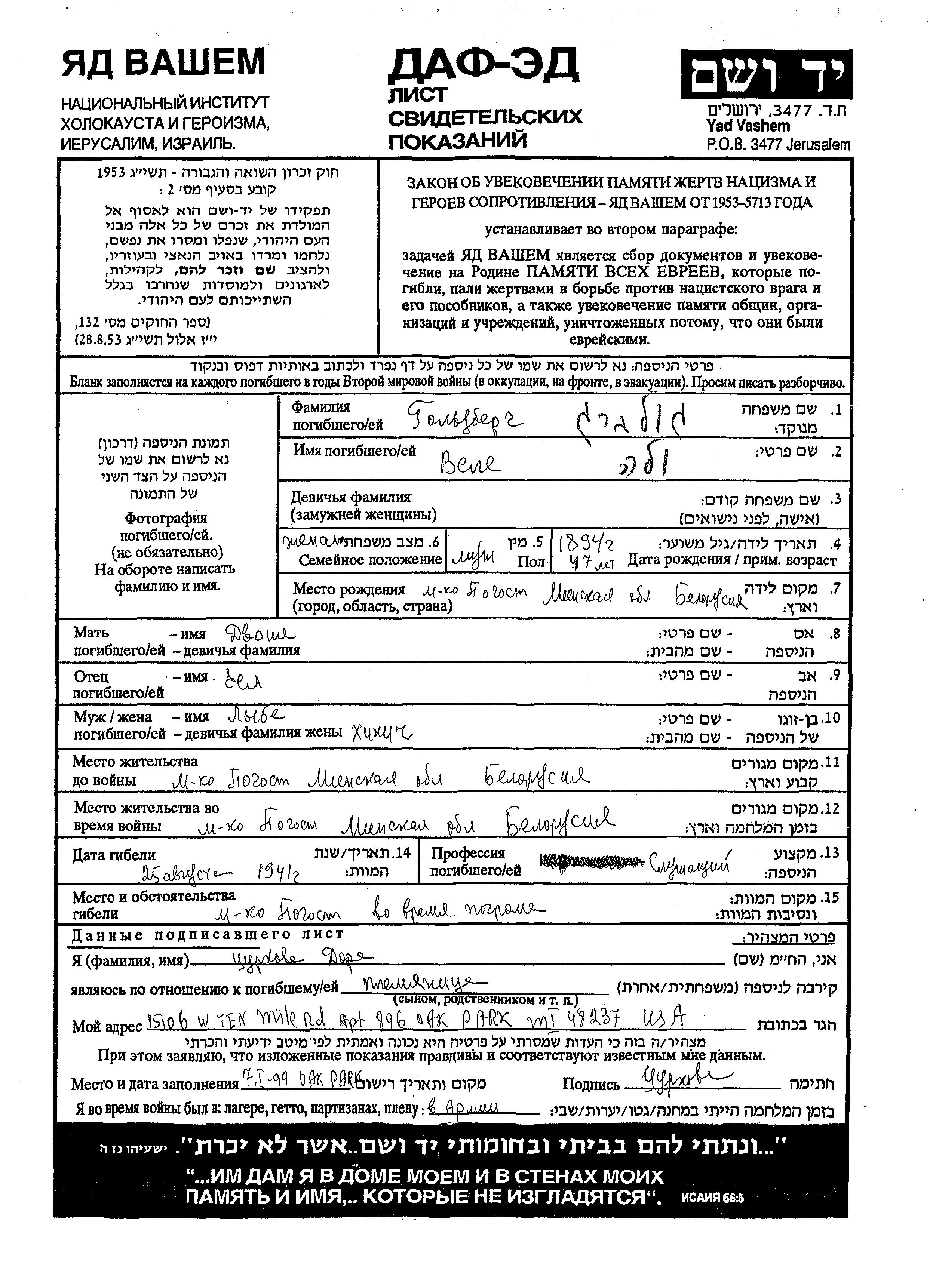 Vele Vala Goldberg wurde im Jahr 1894 in Pogost, Weißrussland (UdSSR) geboren. Sie war die Tochter von Eel und Dvoshe. Sie war Angestellte/-r und mit Lybe, geb. Khinich Verheiratet. Vor dem Zweiten Weltkrieg lebte sie in Pogost, Weißrussland (UdSSR). Während des Krieges war sie in Pogost, Weißrussland (UdSSR).
