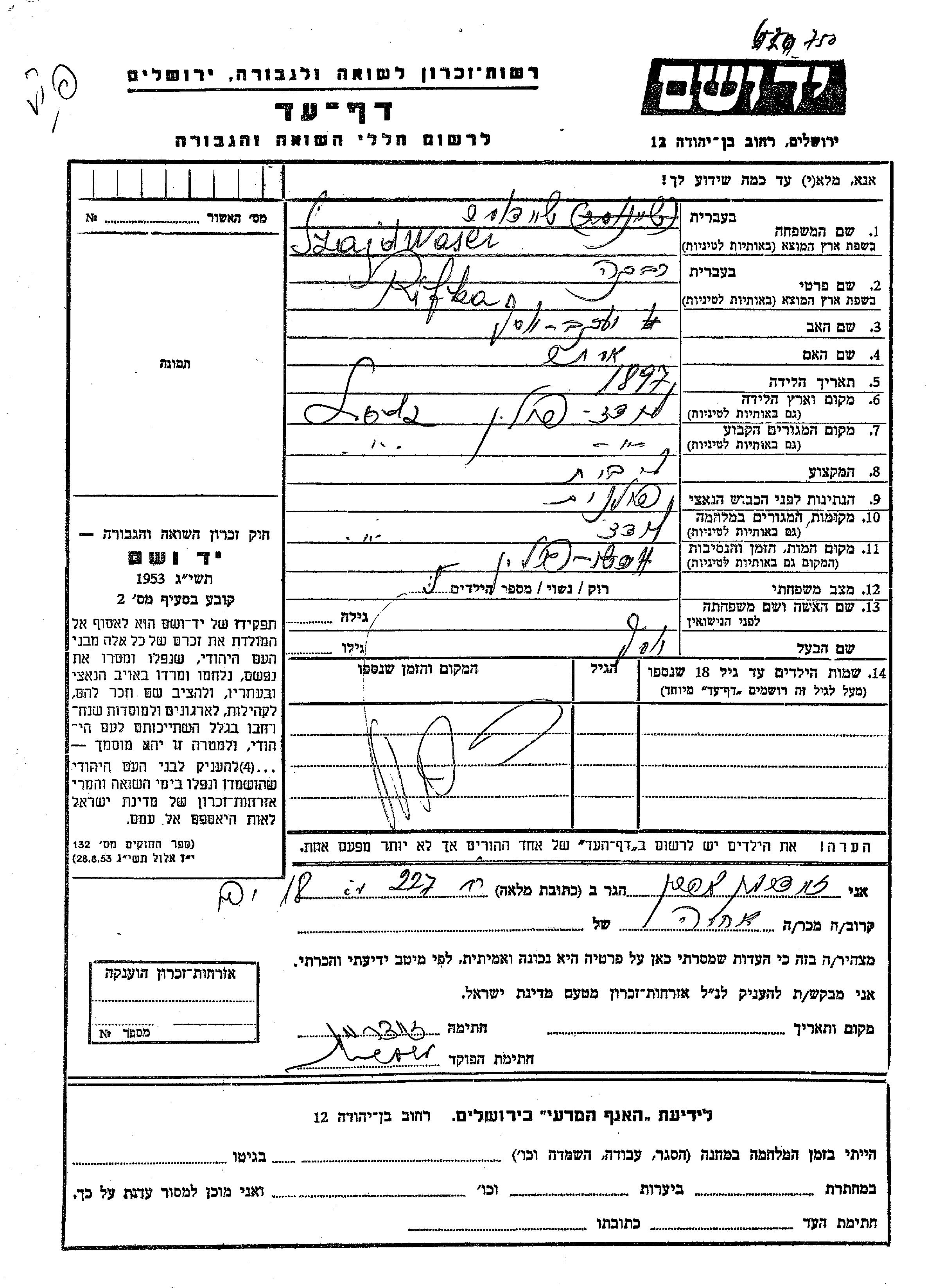 Rivka Szajdwaser wurde im Jahr 1897 in Lodz, Polen geboren. Sie war die Tochter von Yaakov Yosef und Ester. Sie war Hausfrau und mit Yosef Verheiratet. Vor dem Zweiten Weltkrieg lebte sie in Lodz, Polen. Während des Krieges war sie in Lodz, Polen.