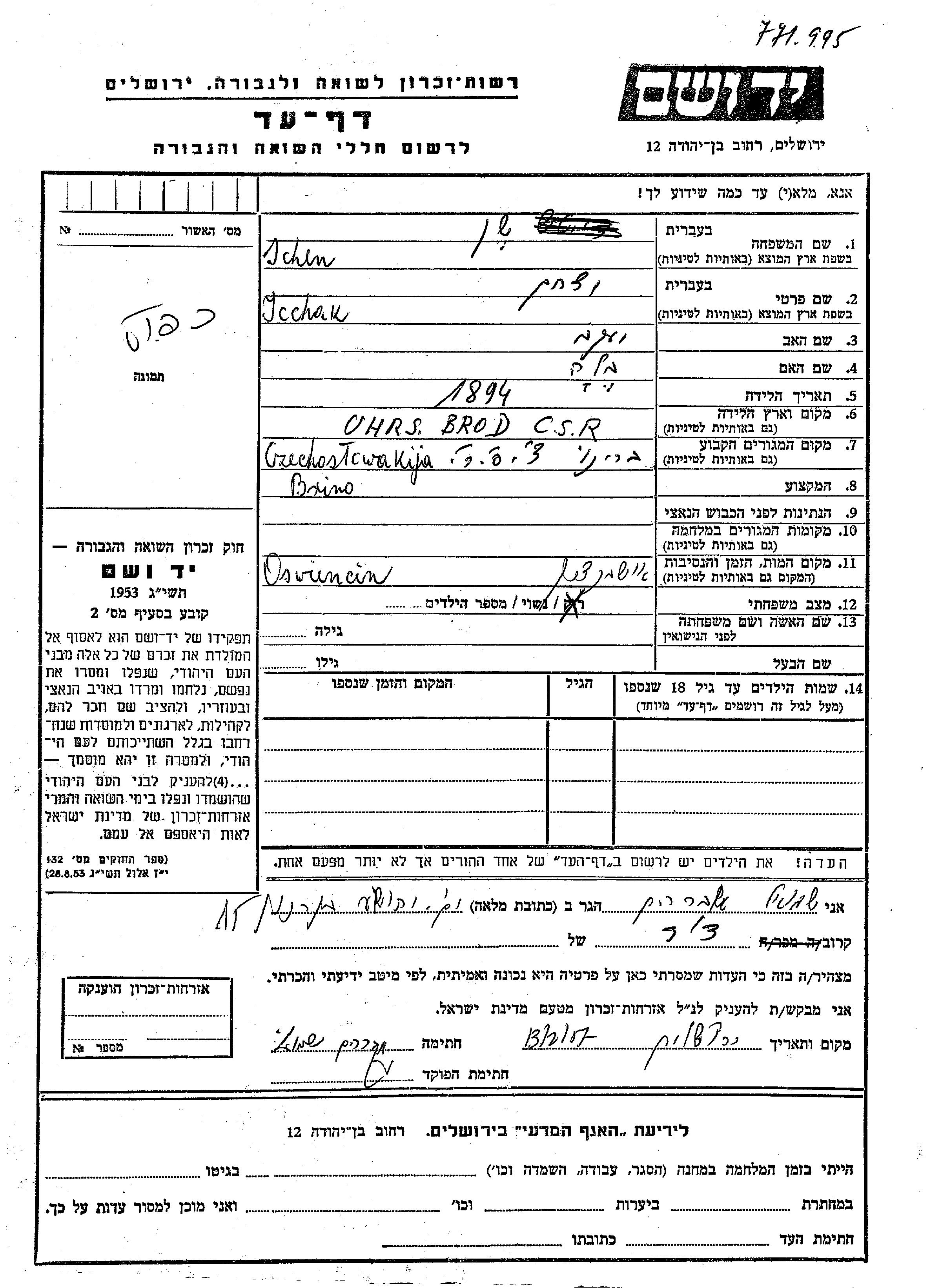 Ycchak wurde in der Schoah ermordet. Todesort: Auschwitz, Polen.