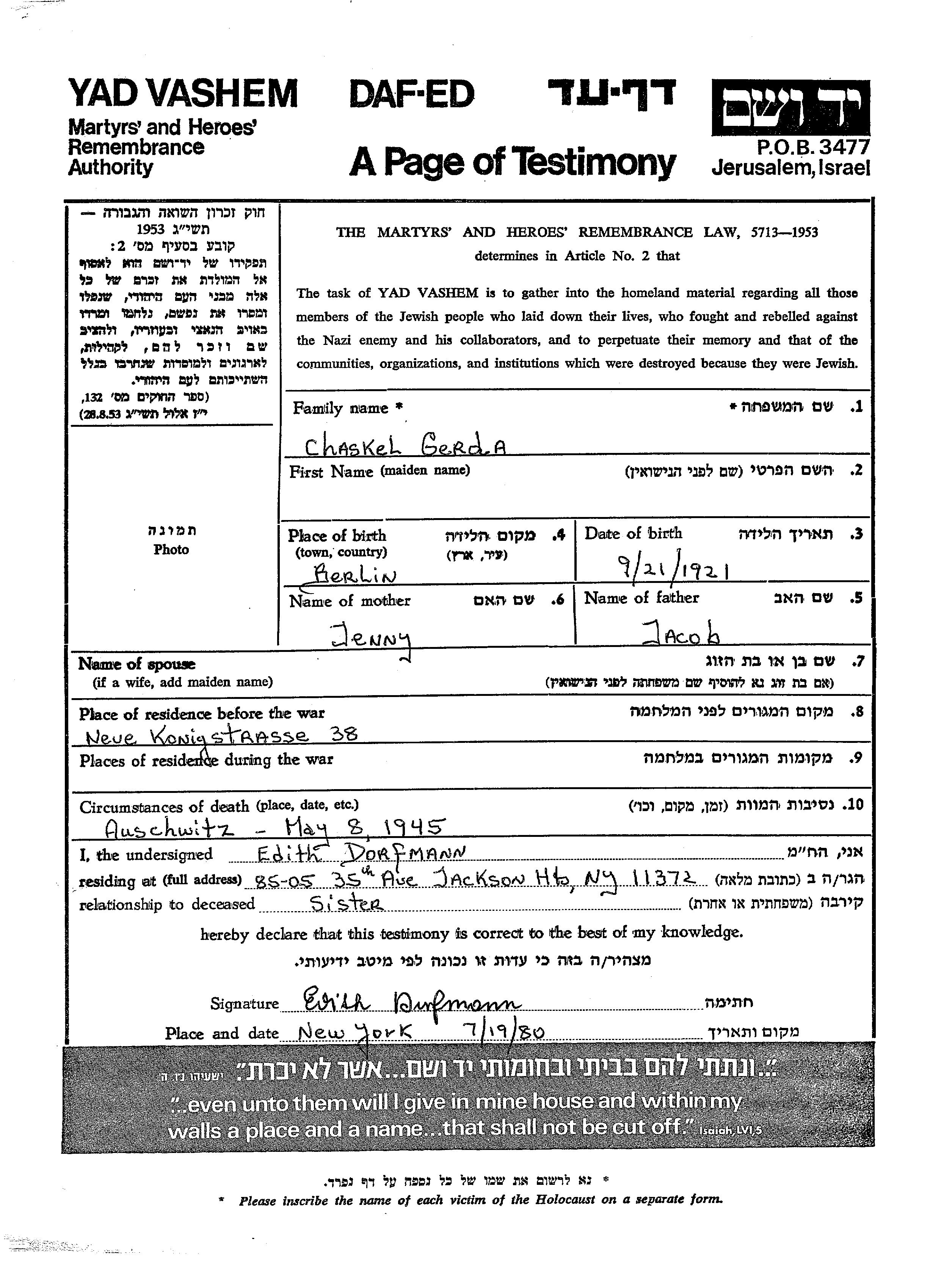 Gerda Chaskel wurde im Jahr 1921 in Berlin, Deutsches Reich geboren. Sie war die Tochter von Jacob und Jenny.