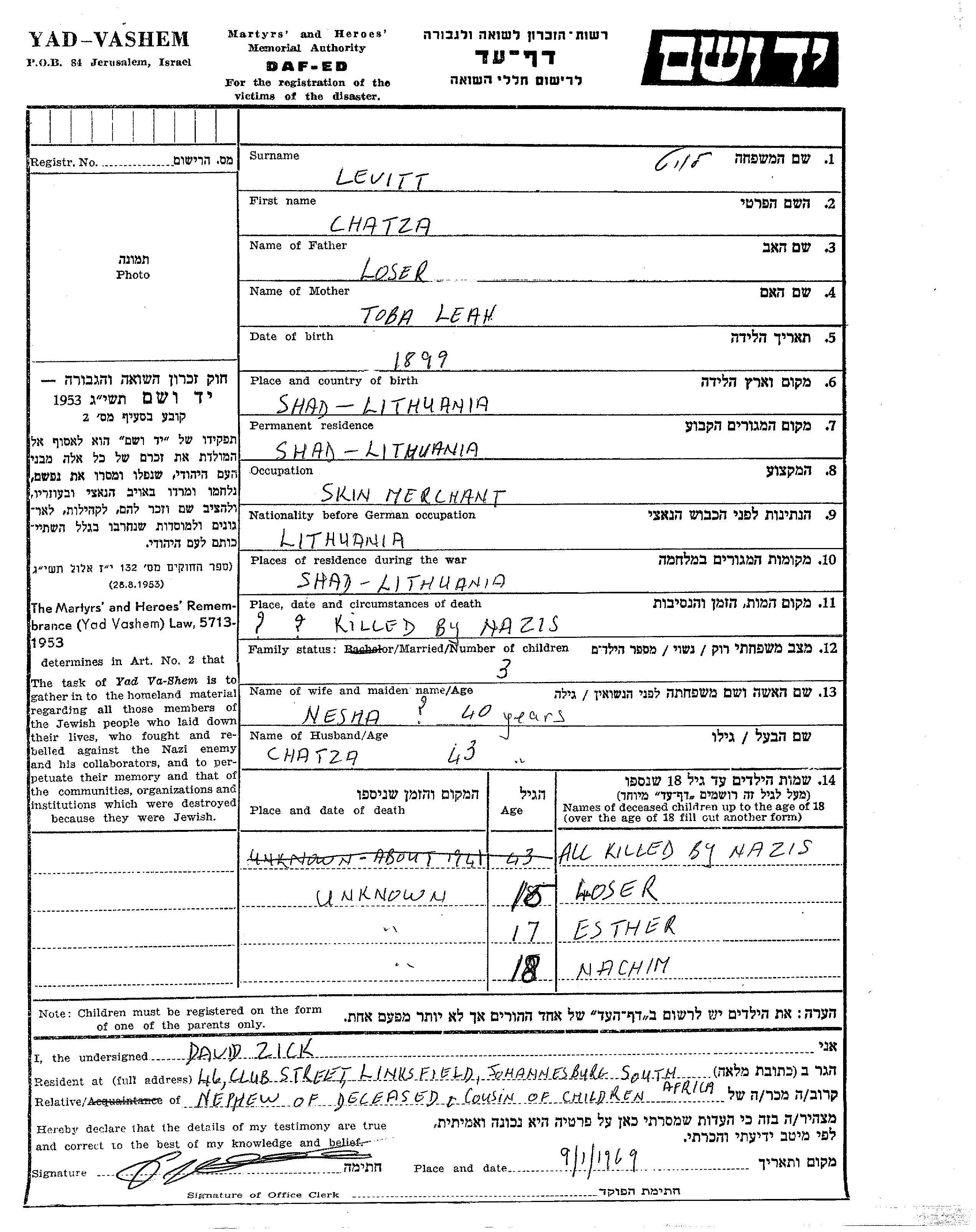 Chatza Levitt wurde im Jahr 1899 in Shad, Litauen geboren. Sie war die Tochter von Loser und Toba Leah. Sie war Lederhändler/-in und mit Nesha Verheiratet. Vor dem Zweiten Weltkrieg lebte sie in Shad, Litauen. Während des Krieges war sie in Shad, Litauen.