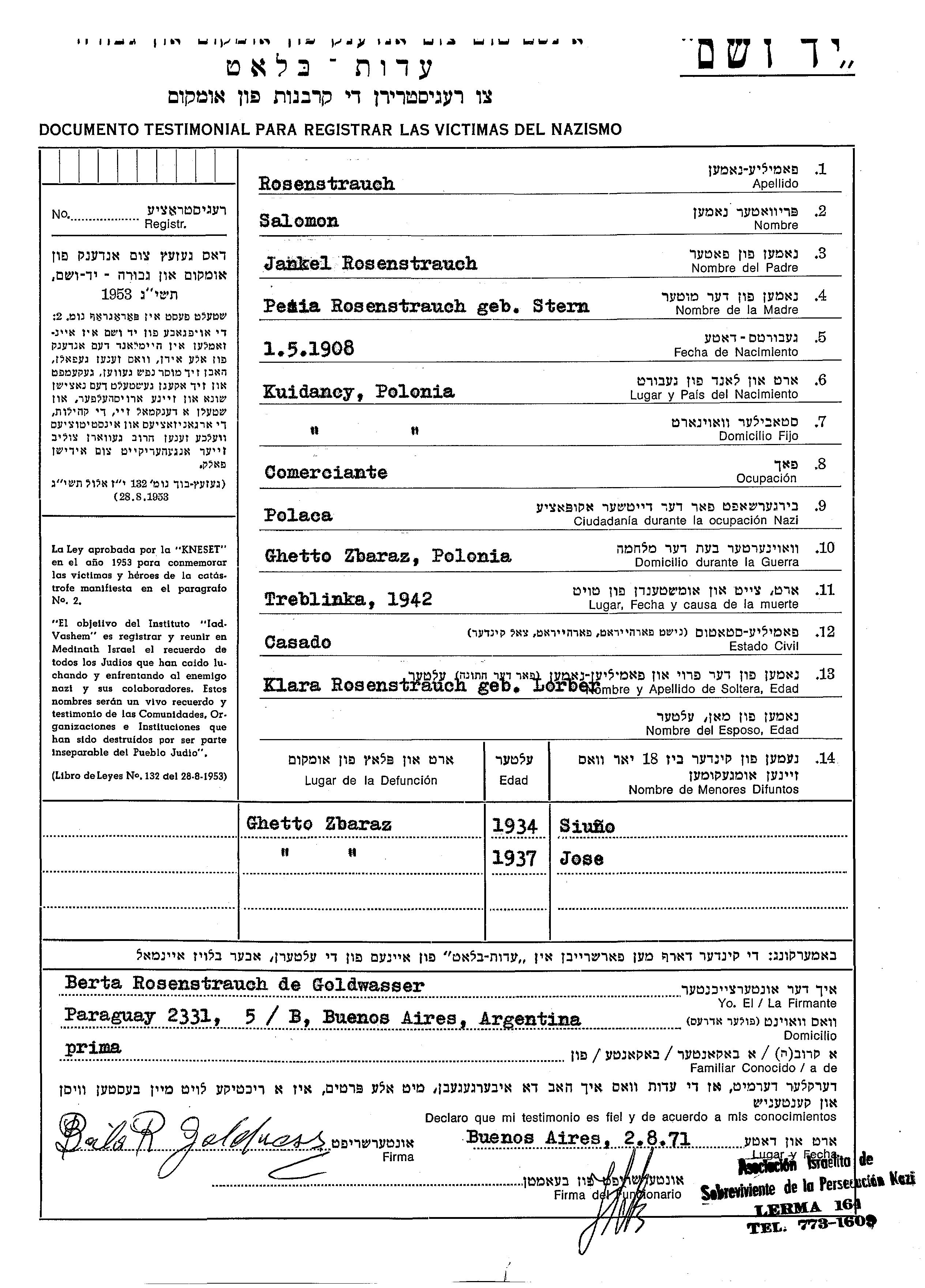 Salomon Rosenstrauch wurde im Jahr 1908 in Kuidancy, Polen geboren. Er war der Sohn von Jankel und Pesia. Er war Kaufmann/-frau und mit Klara, geb. Lorber Verheiratet. Vor dem Zweiten Weltkrieg lebte er in Kuidancy, Polen. Während des Krieges war er in Zbaraz, Polen.