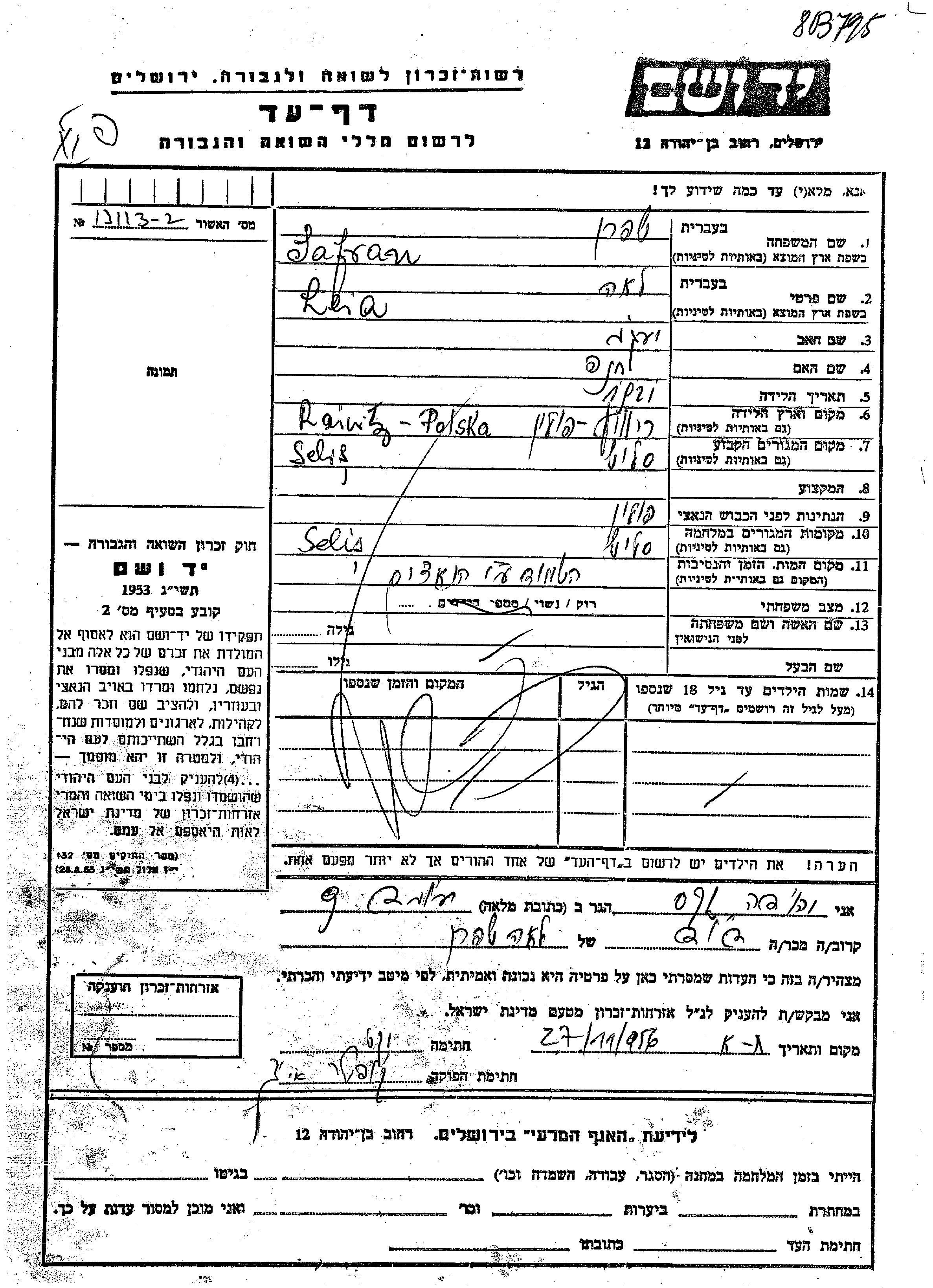 Leia Safran wurde im Jahr 1921 in Rayvitz, Polen geboren. Sie war die Tochter von Yaakov und Khana. Sie war Ledig. Vor dem Zweiten Weltkrieg lebte sie in Selis, Polen. Während des Krieges war sie in Selis, Polen.