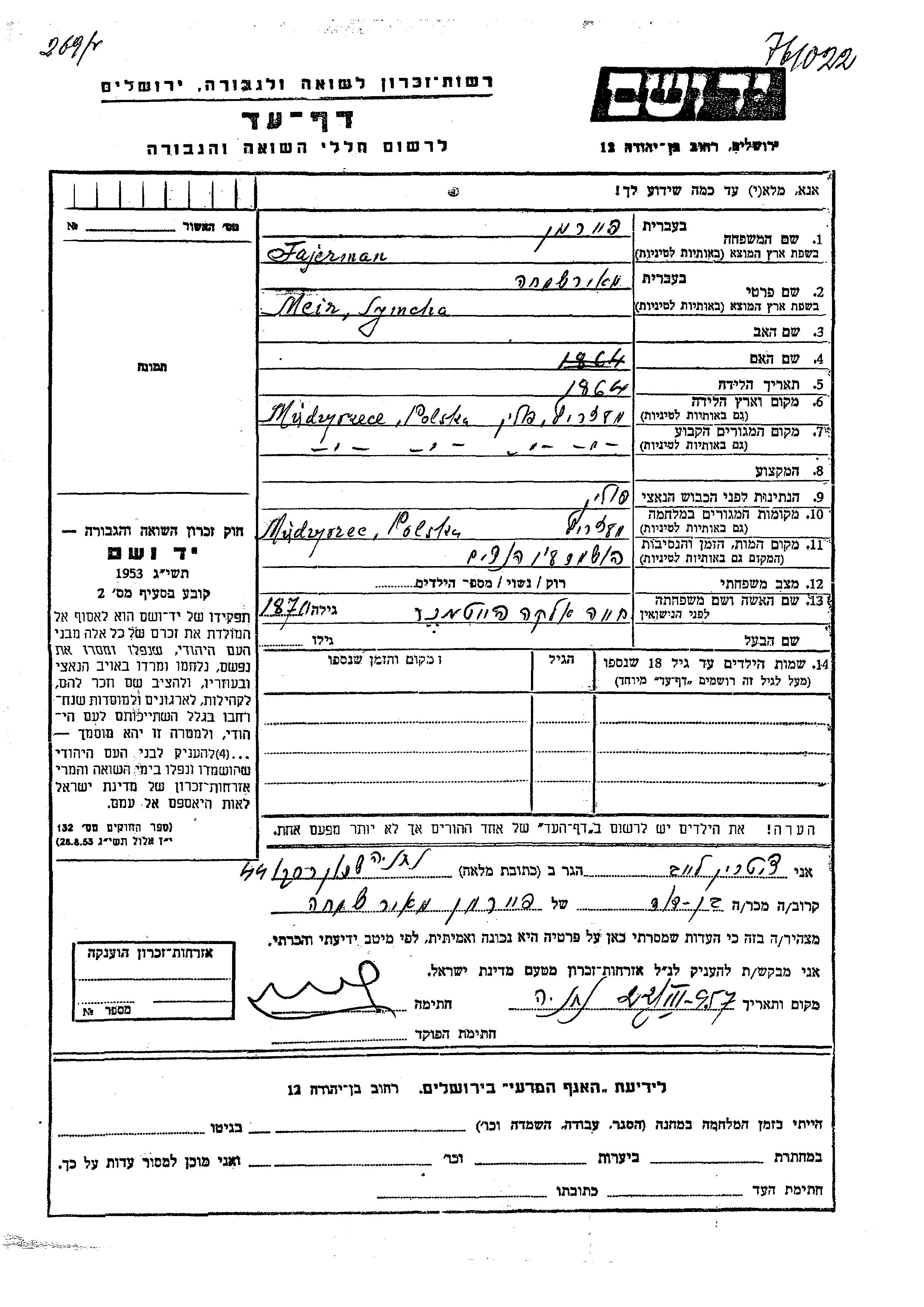 Symcha Meir Fajerman wurde im Jahr 1864 in Miedzyrzecz, Polen geboren. Er war mit Khaia Elka, geb. Fejtmakher Verheiratet. Vor dem Zweiten Weltkrieg lebte er in Miedzyrzecz, Polen. Während des Krieges war er in Miedzyrzecz, Polen.