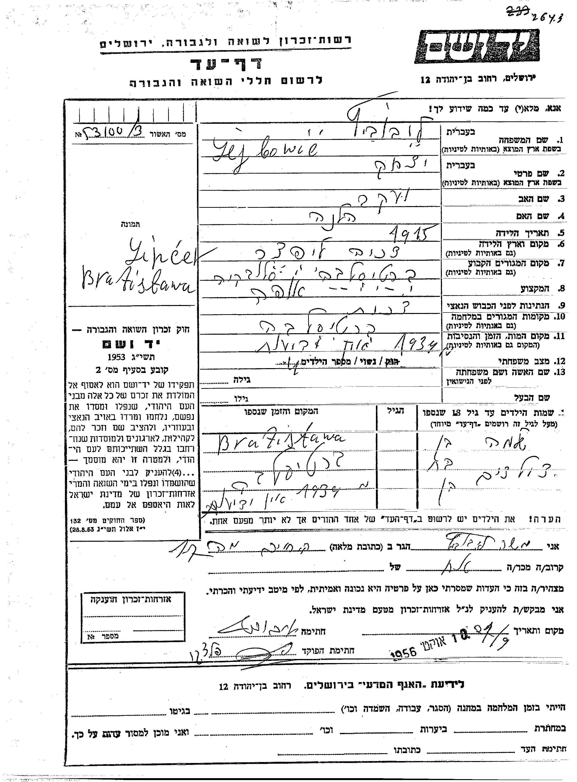 Yitzkhak wurde in der Schoah ermordet. Todesort: unbekannt im Jahr 1939.