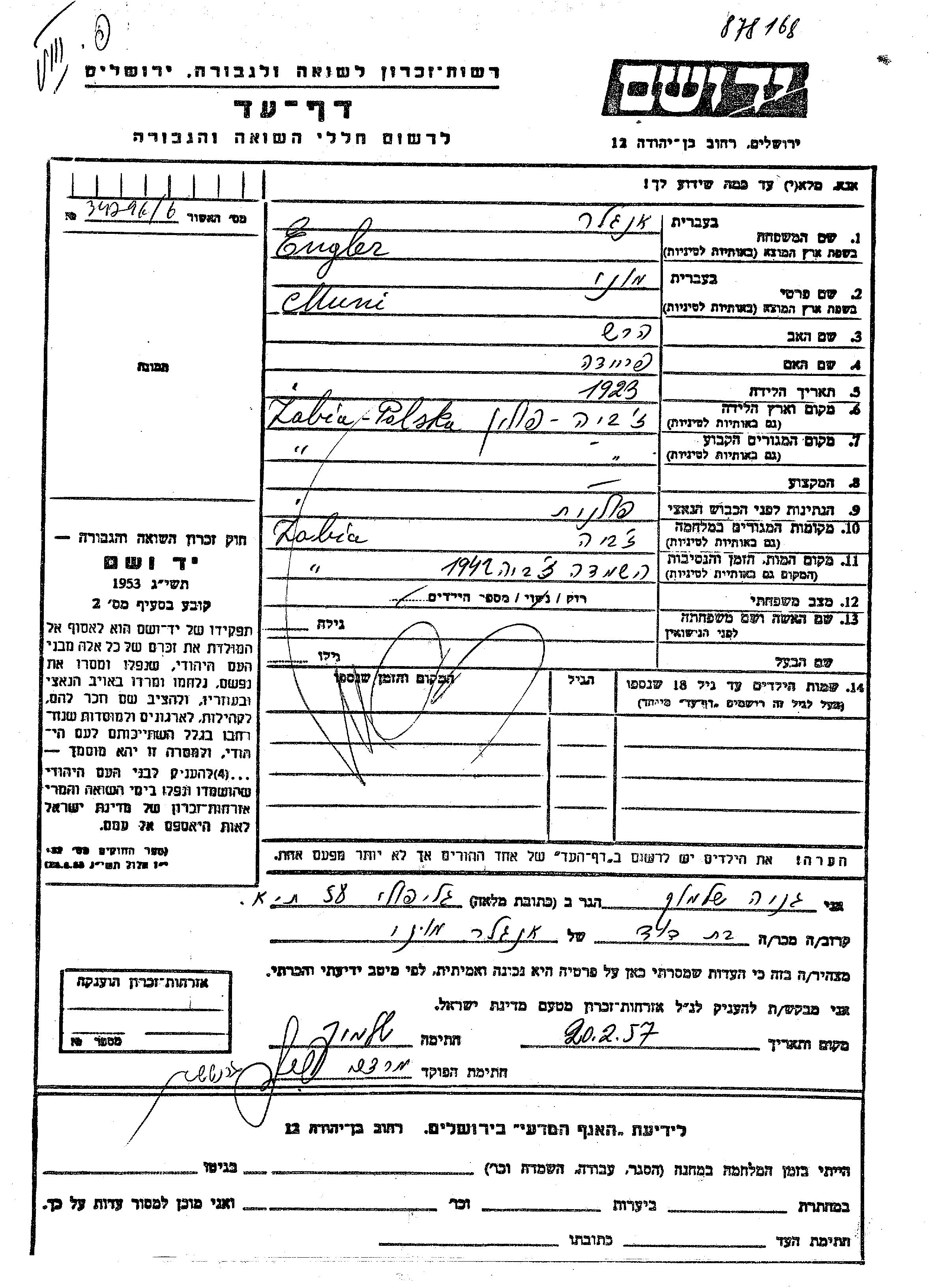 Muni Moni Engler wurde im Jahr 1923 in Zabia, Polen geboren. Er war der Sohn von Hersh und Freida. Er war Ledig. Vor dem Zweiten Weltkrieg lebte er in Zabia, Polen. Während des Krieges war er in Zabia, Polen.