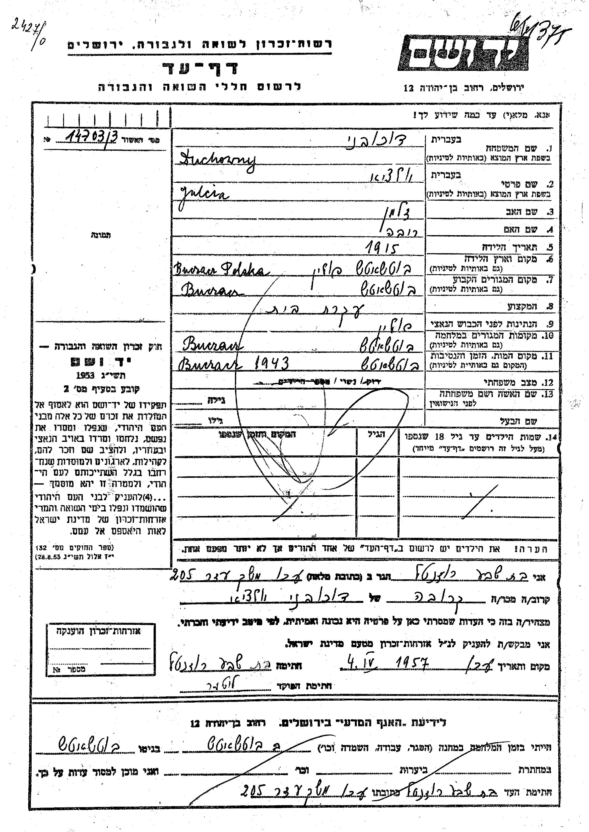 Yulcia Duchowny wurde im Jahr 1915 in Buczacz, Polen geboren. Sie war die Tochter von Zalman und Riva. Sie war Hausfrau und Verheiratet. Vor dem Zweiten Weltkrieg lebte sie in Buczacz, Polen. Während des Krieges war sie in Buczacz, Polen.