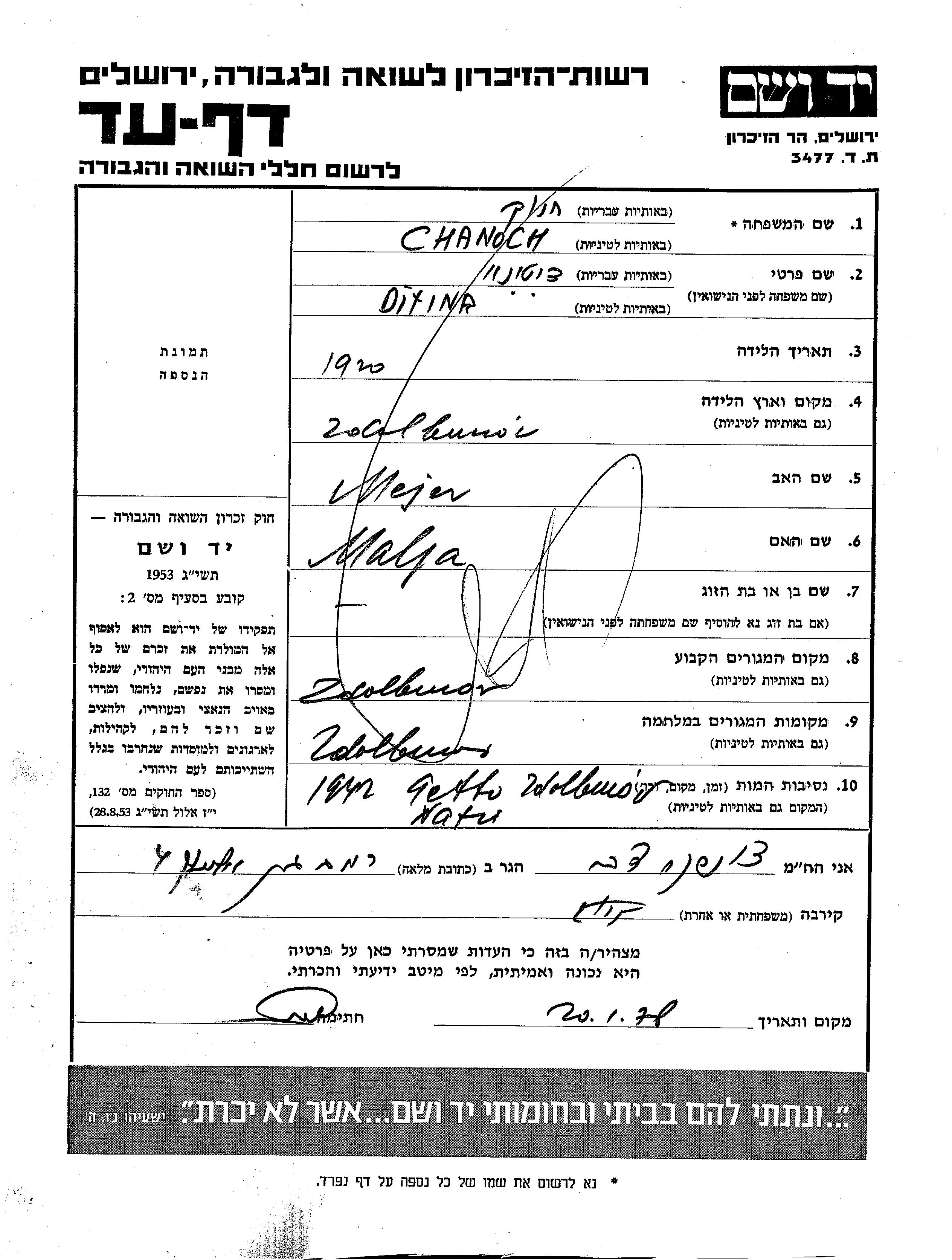 Chanoch wurde in der Schoah ermordet. Todesort: Zdolbunow, Polen im Jahr 1942.