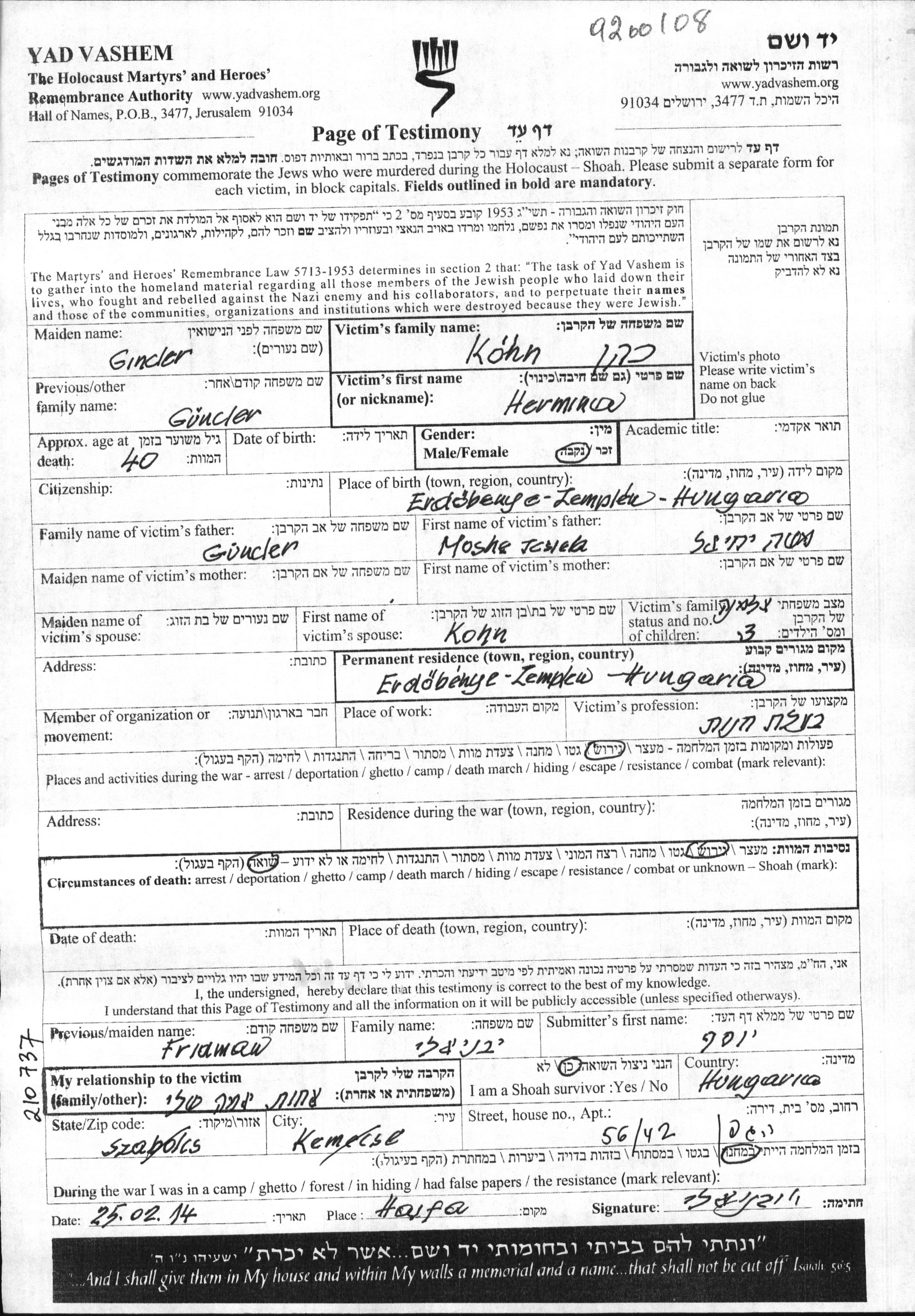 Hermina Kóhn, geb. Guntzler wurde in Erdobenye, Ungarn geboren. Sie war Ladenbesitzer/-in. Vor dem Zweiten Weltkrieg lebte sie in Erdobenye, Ungarn.
