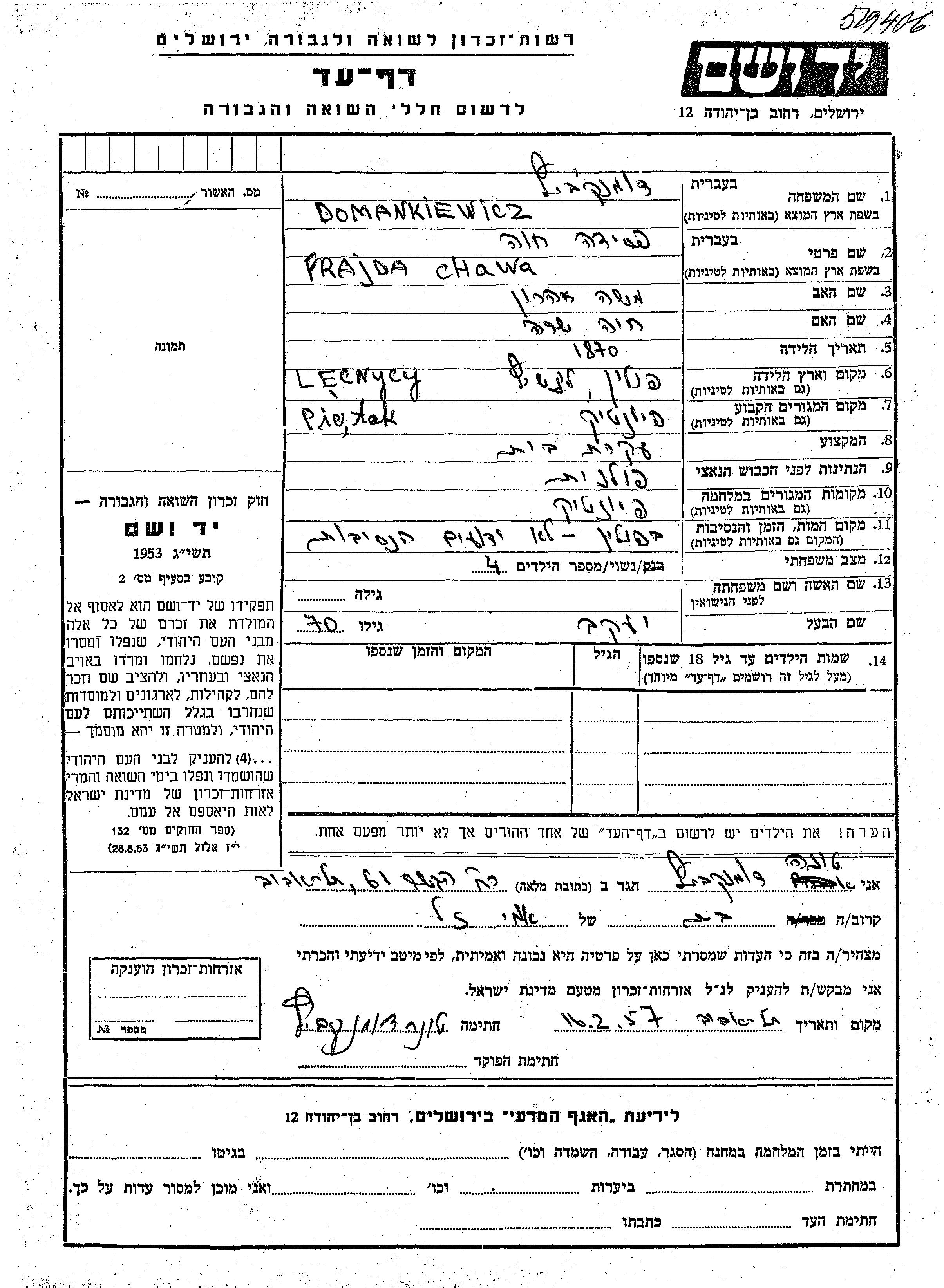 Frajda Chawa Domankiewicz wurde im Jahr 1870 in Leczyca, Polen geboren. Sie war die Tochter von Moshe Aharon und Khaia Sara. Sie war Hausfrau und mit Yaakov Verheiratet. Vor dem Zweiten Weltkrieg lebte sie in Piatek, Polen. Während des Krieges war sie in Piatek, Polen.
