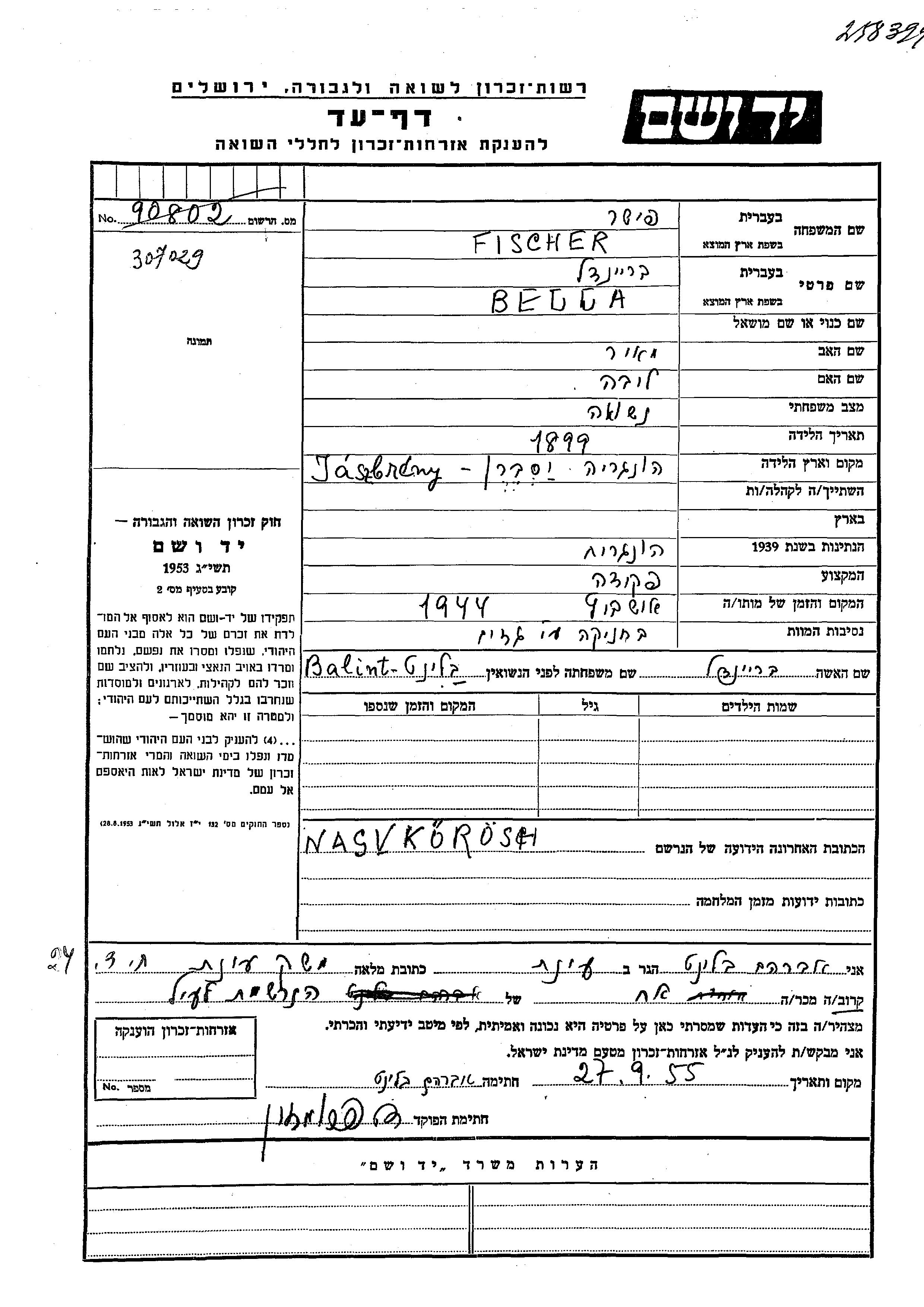 Bella Braindel Fischer, geb. Balint wurde im Jahr 1899 in Jaszbereny, Ungarn geboren. Sie war die Tochter von Yair und Liba. Sie war Angestellte/-r und Verheiratet. Vor dem Zweiten Weltkrieg lebte sie in Nagykoros, Ungarn.