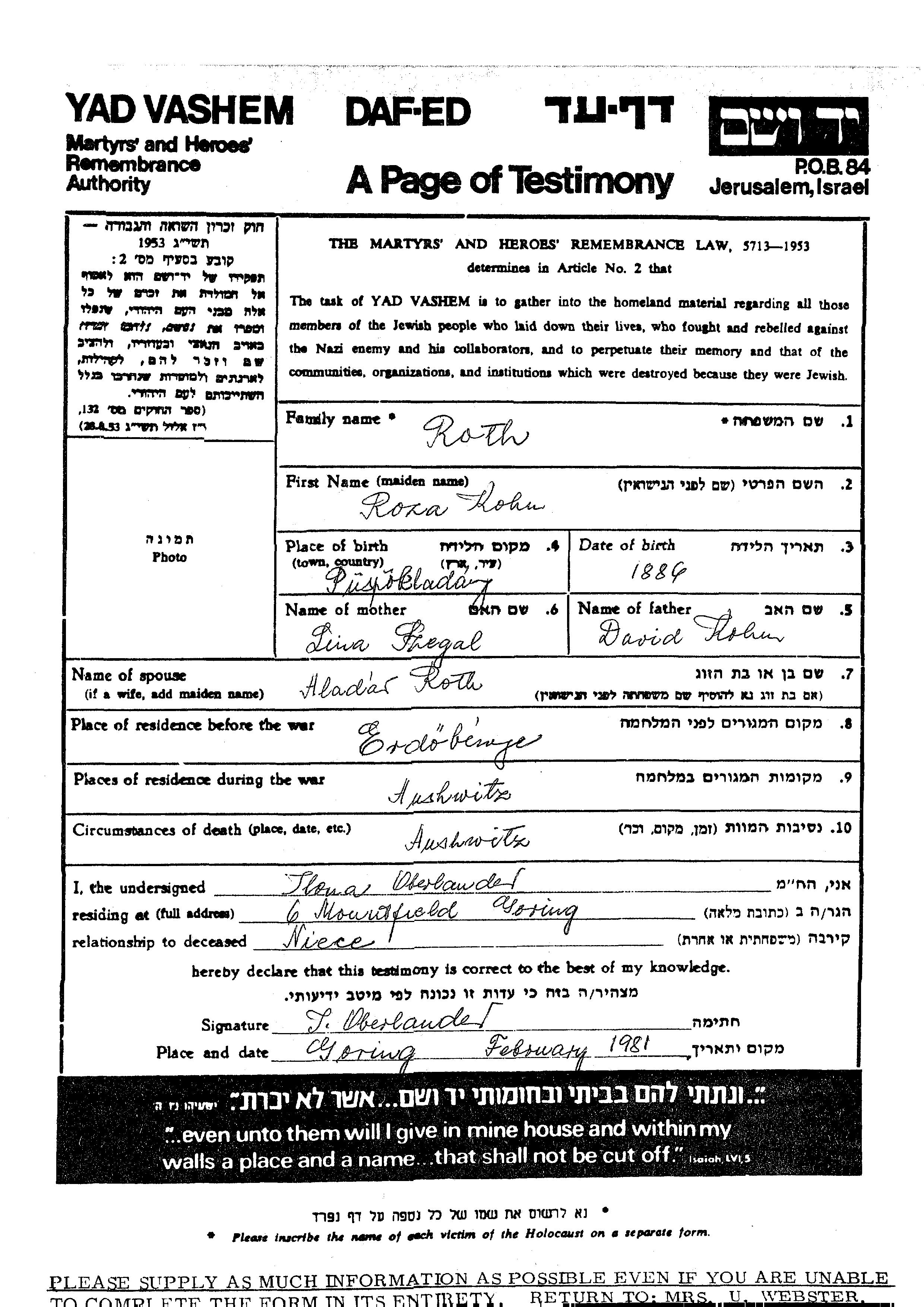 Roza Roth, geb. Kohn wurde im Jahr 1884 in Puspokladany, Ungarn geboren. Sie war die Tochter von David und Lina. Sie war mit Aladar Verheiratet. Vor dem Zweiten Weltkrieg lebte sie in Erdobenye, Ungarn. Während des Krieges war sie in Auschwitz, Polen.