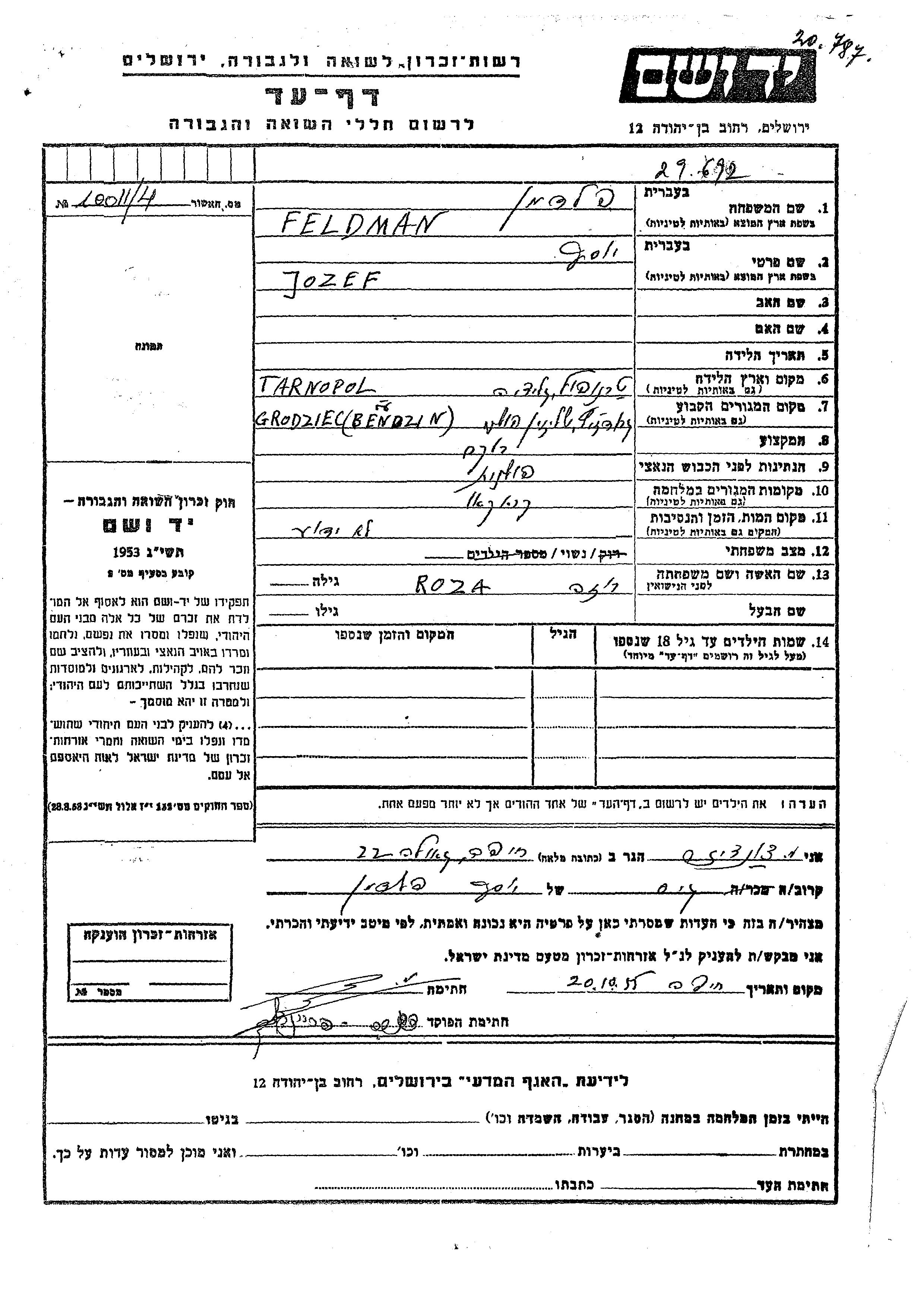 Josef Feldman wurde in Tarnopol, Polen geboren. Er war Apotheker/-in und mit Roza Verheiratet. Vor dem Zweiten Weltkrieg lebte er in Grodziec, Polen. Während des Krieges war er in Krakau, Polen.