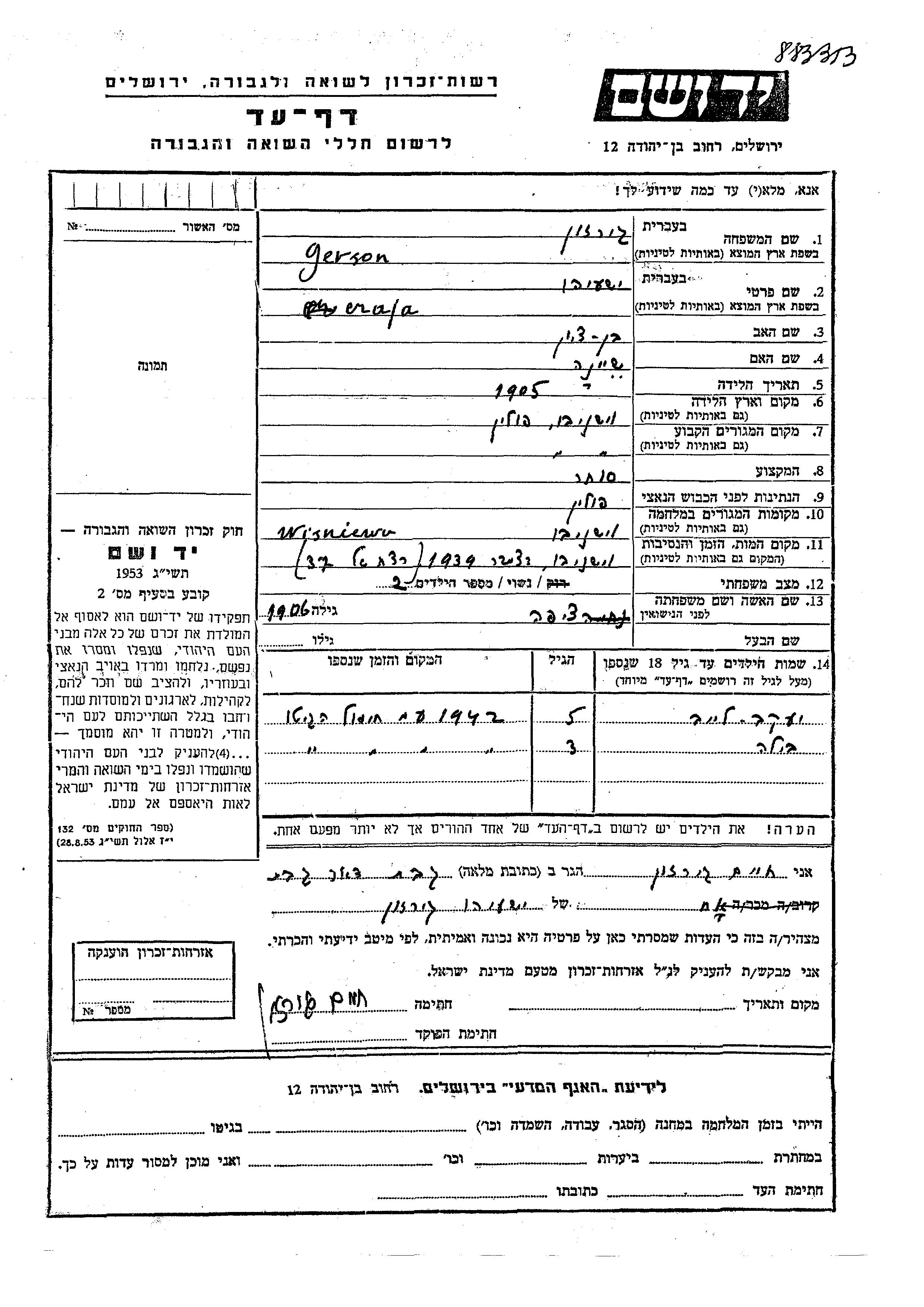 Czaja Gerson Girzon wurde im Jahr 1905 in Wisznievo, Polen geboren. Er war der Sohn von Bentzion und Sheina. Er war Kaufmann/-frau und mit Tzipa Verheiratet. Vor dem Zweiten Weltkrieg lebte er in Wisznievo, Polen. Während des Krieges war er in Wisznievo, Polen.
