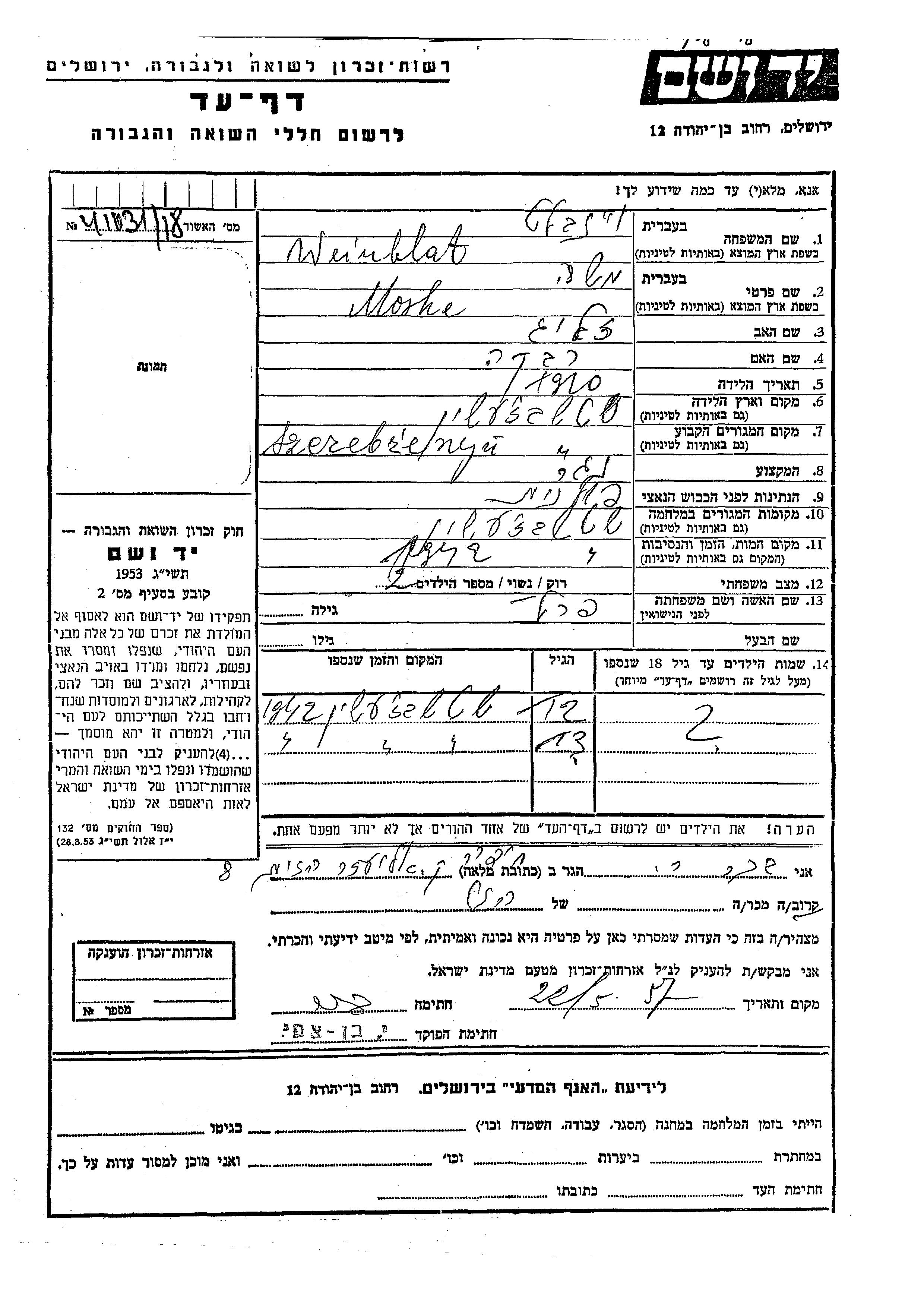 Moshe Weinblat wurde im Jahr 1910 in Szczebrzeszyn, Polen geboren. Er war der Sohn von Zelig und Rivka. Er war Zimmermann und mit Perel Verheiratet. Vor dem Zweiten Weltkrieg lebte er in Szczebrzeszyn, Polen.