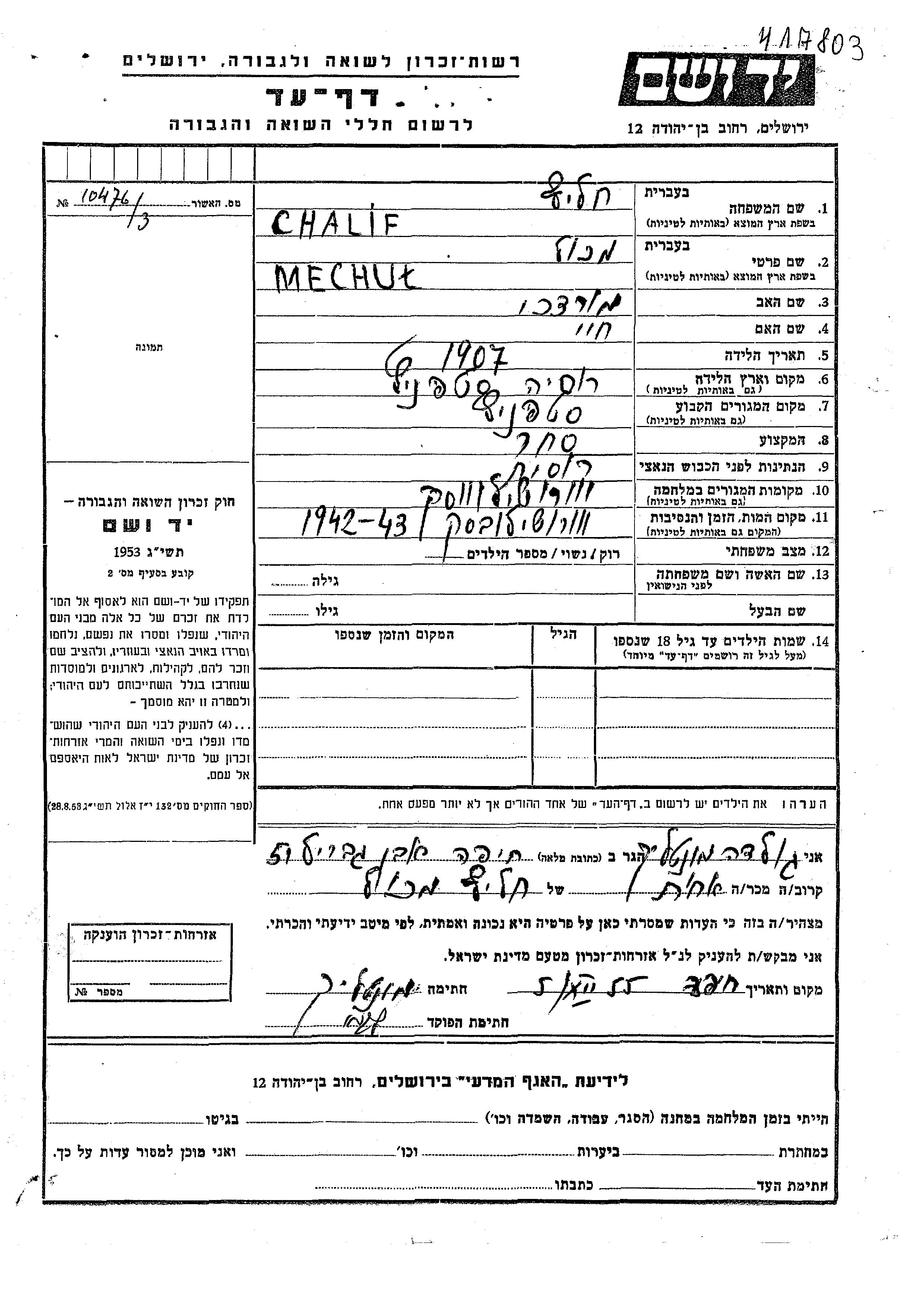 Mechul wurde in der Schoah ermordet. Todesort: Voroshilovsk, Russland (UdSSR) im Jahr 1942.