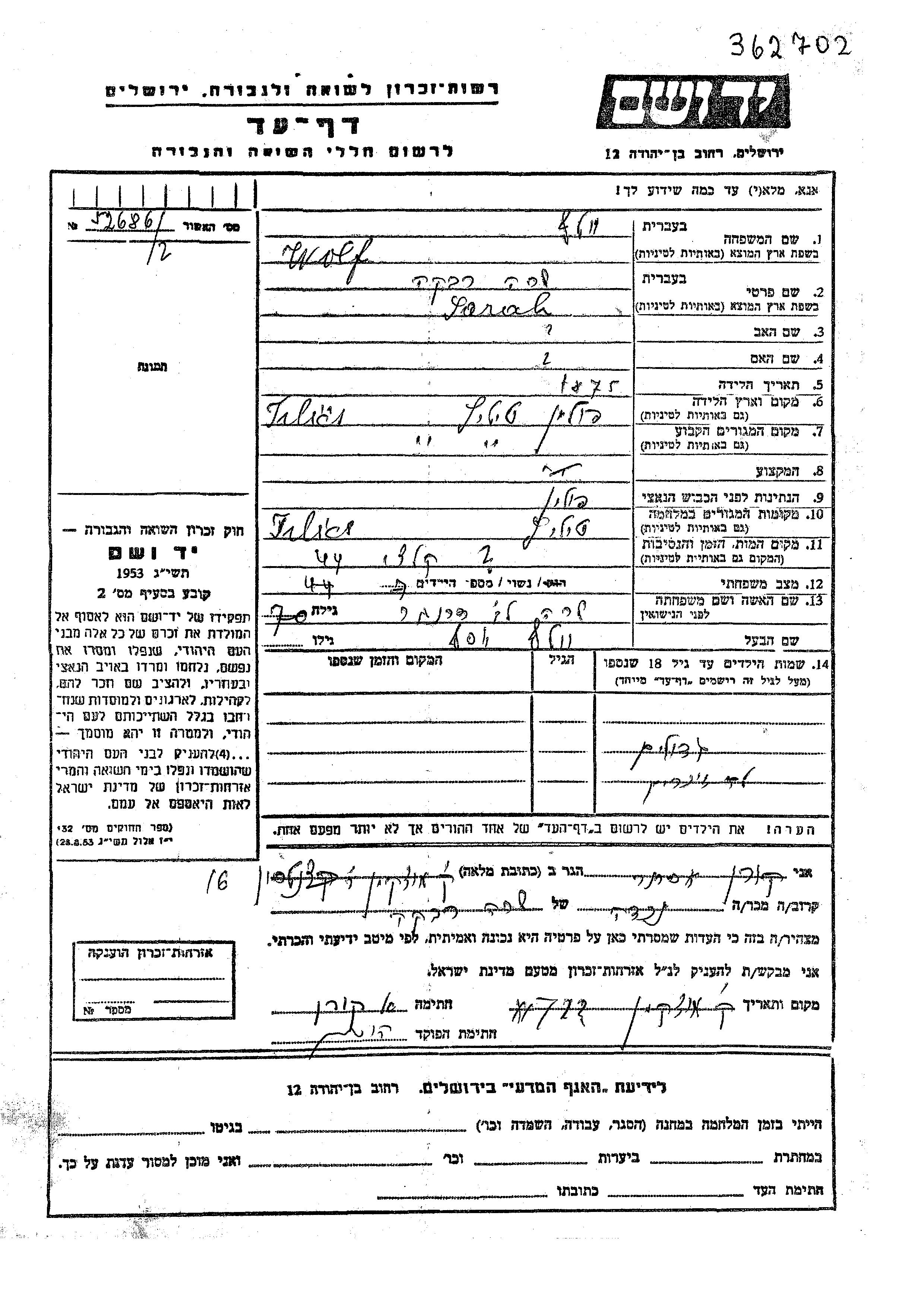 Sarah Rivka Wolf, geb. Drenger wurde im Jahr 1875 in Tylicz, Polen geboren. Sie war mit Yosef Verheiratet. Vor dem Zweiten Weltkrieg lebte sie in Tylicz, Polen. Während des Krieges war sie in Tylicz, Polen.
