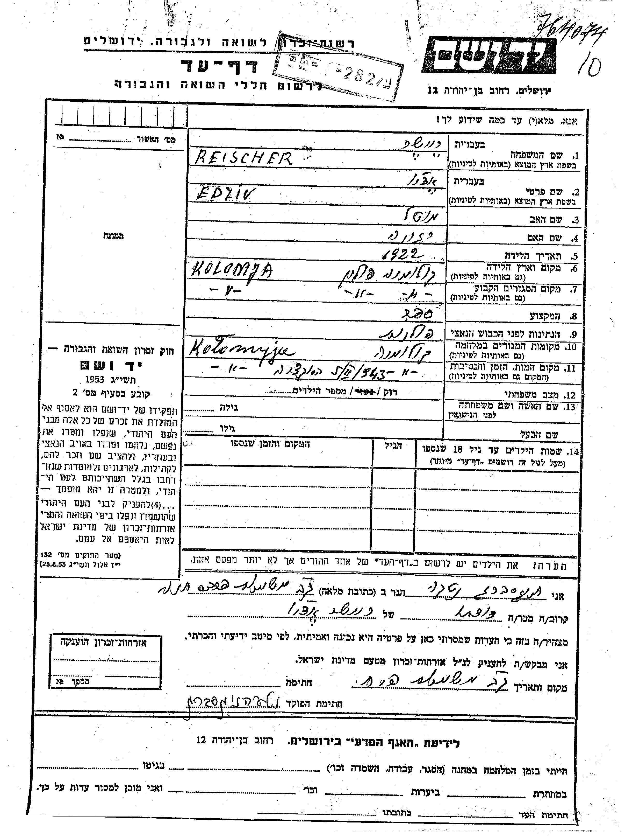 Edzio Ezio Reischer wurde im Jahr 1922 in Kolomyja, Polen geboren. Er war der Sohn von Motel und Regina. Er war Friseur/-in und Ledig. Vor dem Zweiten Weltkrieg lebte er in Kolomyja, Polen. Während des Krieges war er in Kolomyja, Polen.