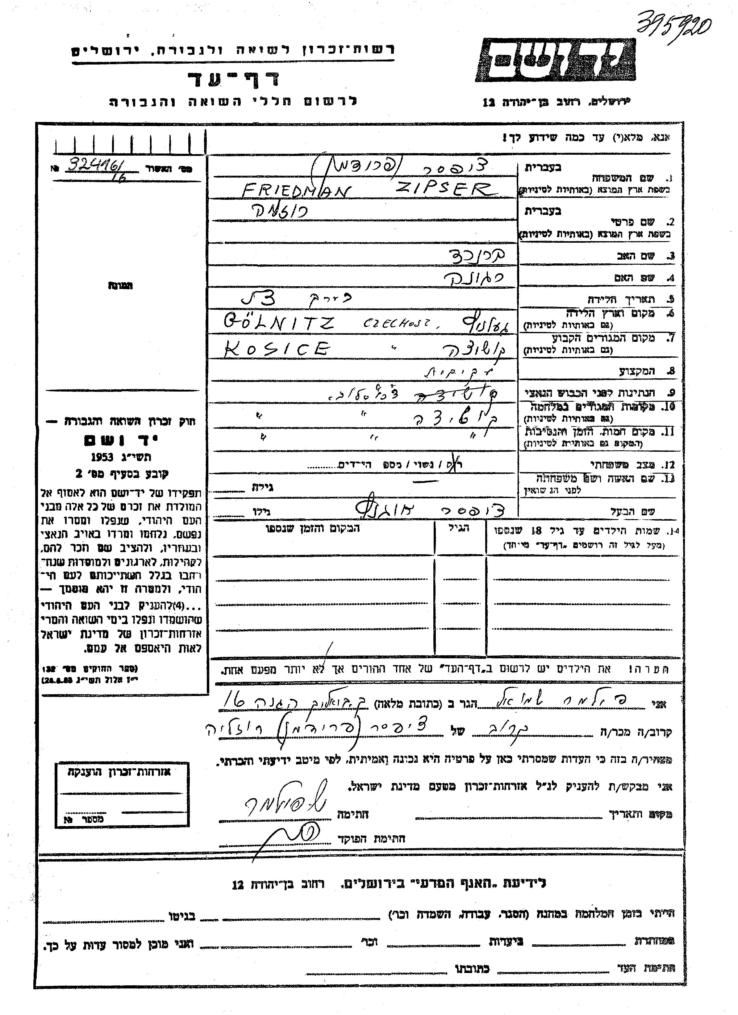 Rozalia Zipser, geb. Friedman wurde in Gelnica, Tschechoslowakei geboren. Sie war die Tochter von Bernard und Regina. Sie war Hausfrau und mit Ignatz Verheiratet. Vor dem Zweiten Weltkrieg lebte sie in Kosice, Tschechoslowakei. Während des Krieges war sie in Kosice, Tschechoslowakei.