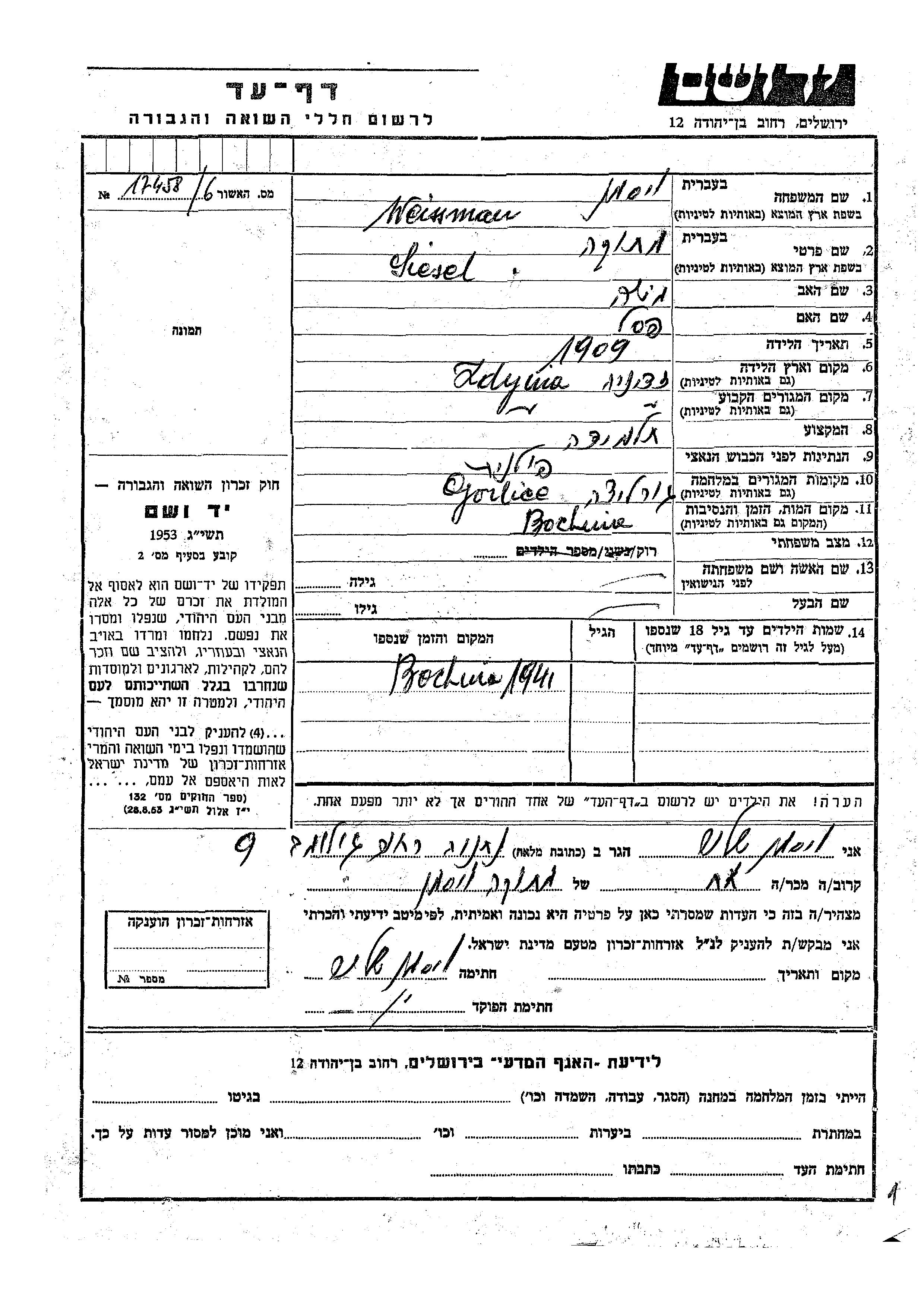 Siesel Metuka Weisman wurde im Jahr 1909 in Żdynia, Polen geboren. Sie war die Tochter von Moshe und Pesel. Sie war Schüler/-in und Ledig. Vor dem Zweiten Weltkrieg lebte sie in Żdynia, Polen. Während des Krieges war sie in Gorlice, Polen.