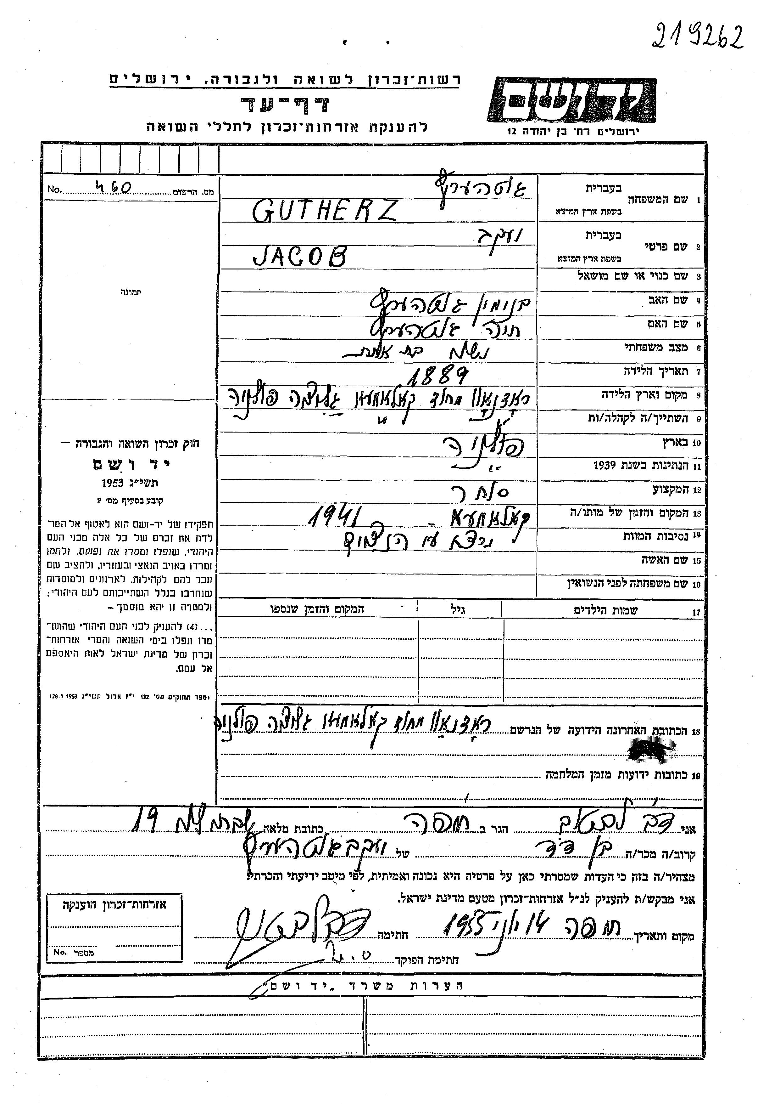 Jacob wurde in der Schoah ermordet. Todesort: unbekannt im Jahr 1941.