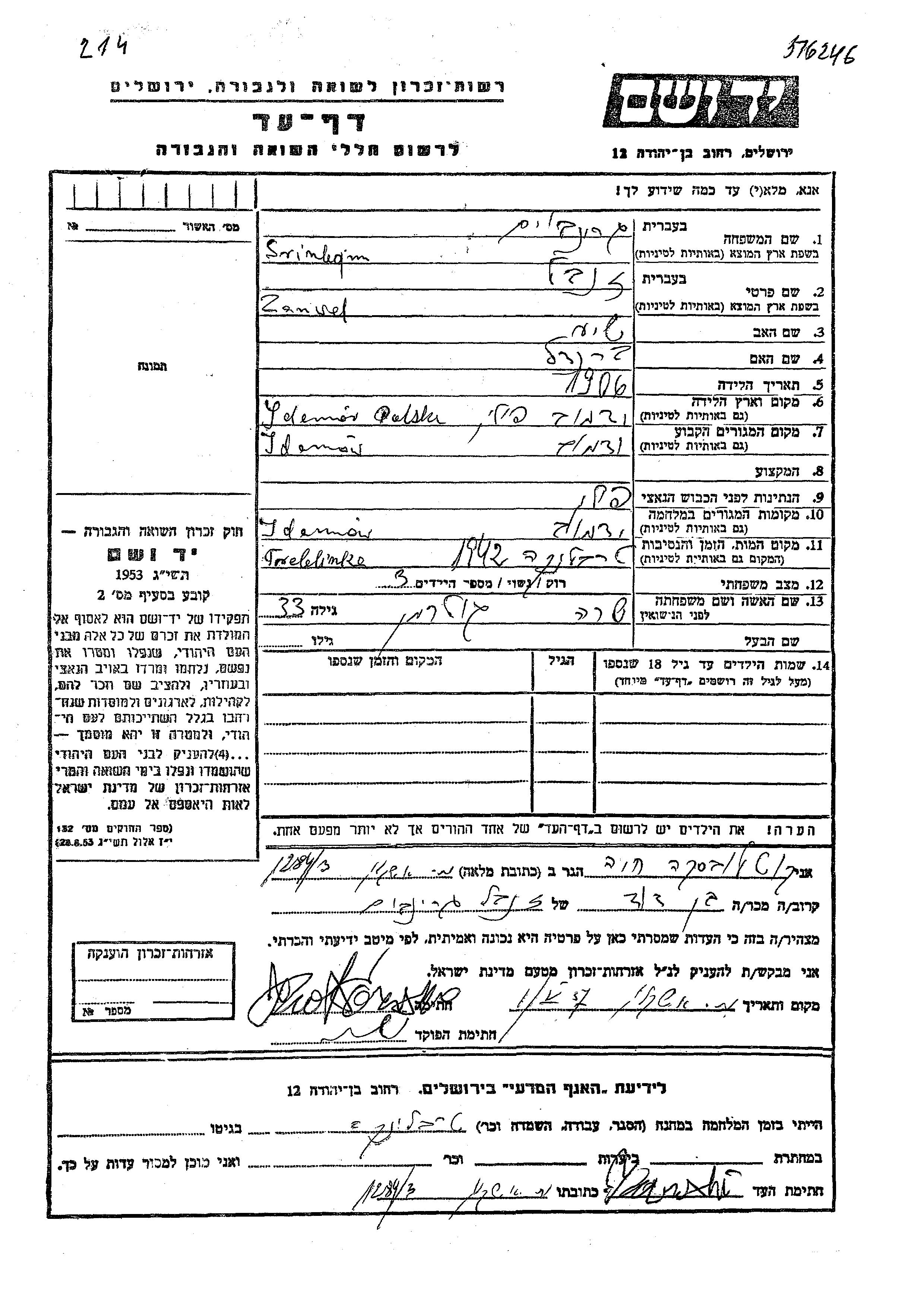 Grinbojm Zanvel 1906 Idamow, Polen Gedenkblatt
