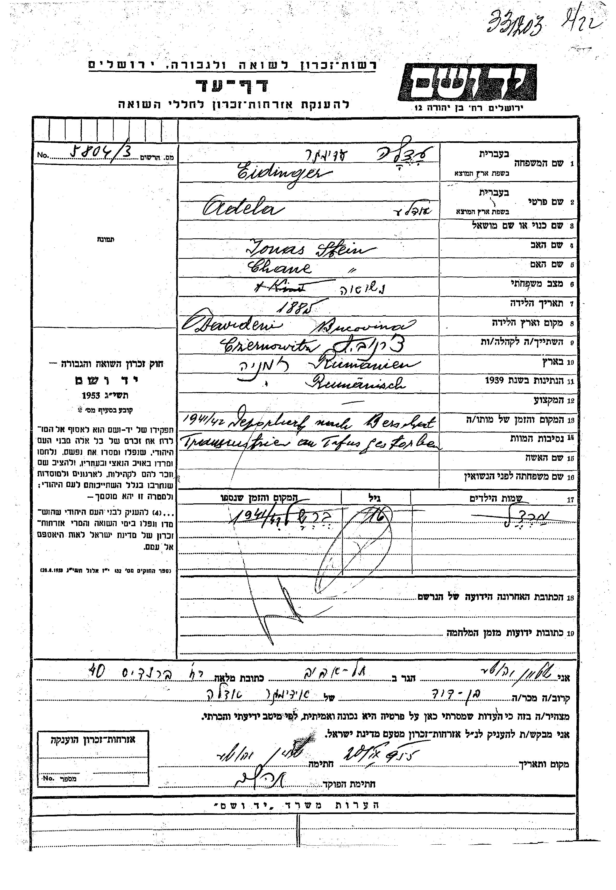 Adela Eidinger wurde im Jahr 1885 in Davideni, Rumänien geboren. Sie war die Tochter von Jonas und Chane. Sie war Verheiratet. Vor dem Zweiten Weltkrieg lebte sie in Czernowitz, Rumänien. Während des Krieges war sie in Czernowitz, Rumänien.