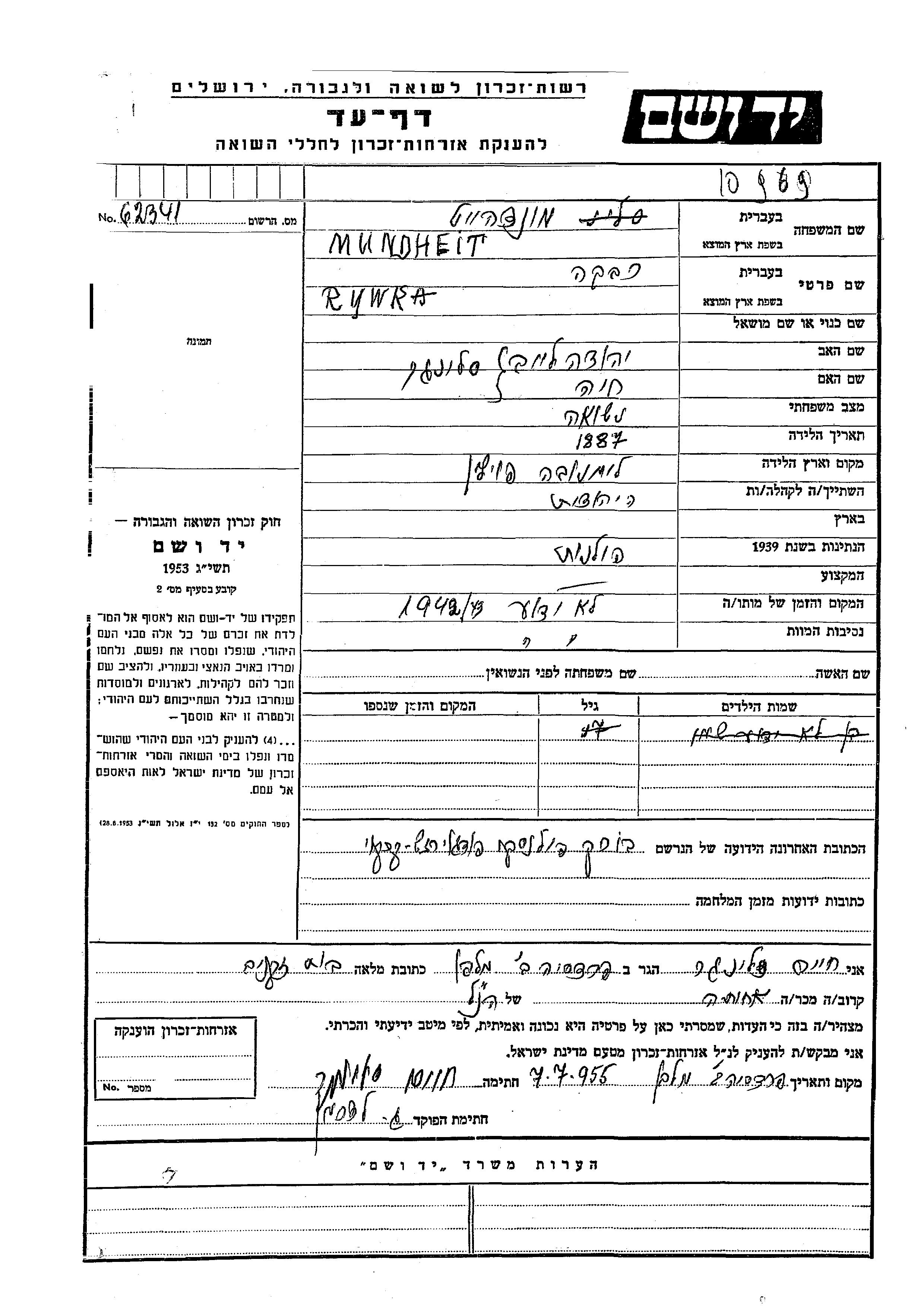 Rywka Mundheit, geb. Selinger wurde im Jahr 1887 geboren. Sie war die Tochter von Yehuda Leib und Khaia. Sie war Verheiratet.